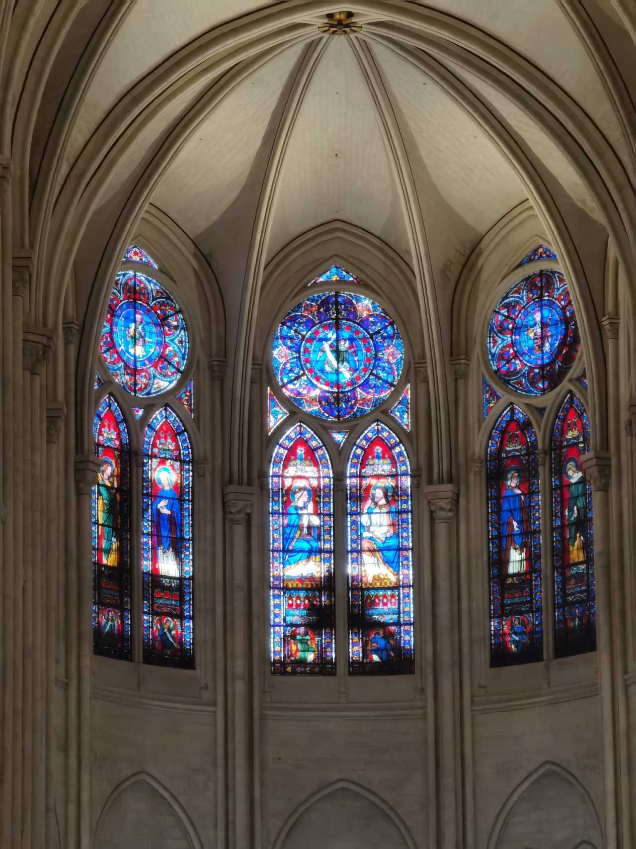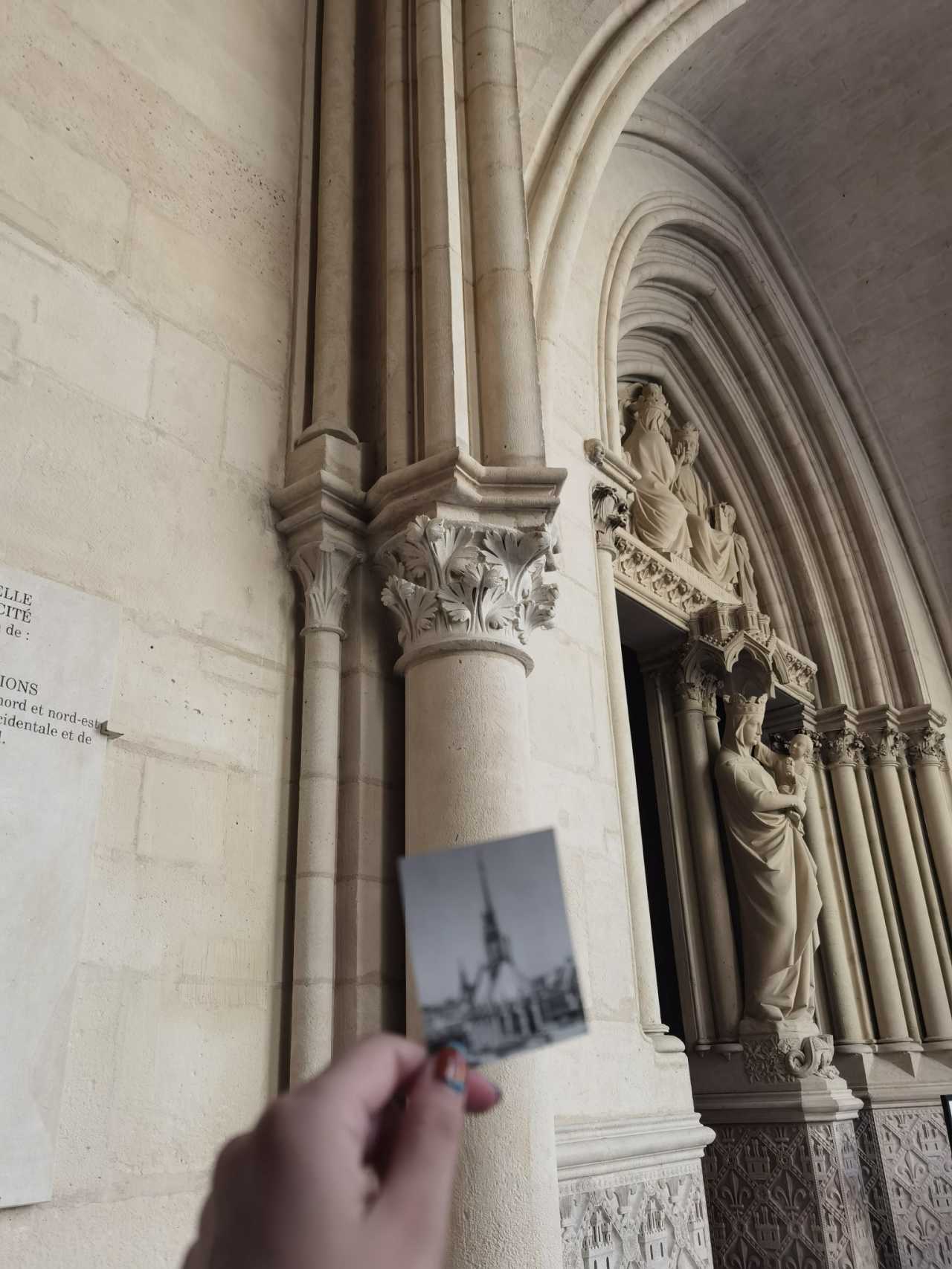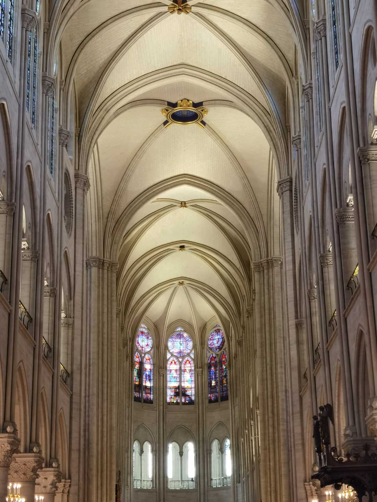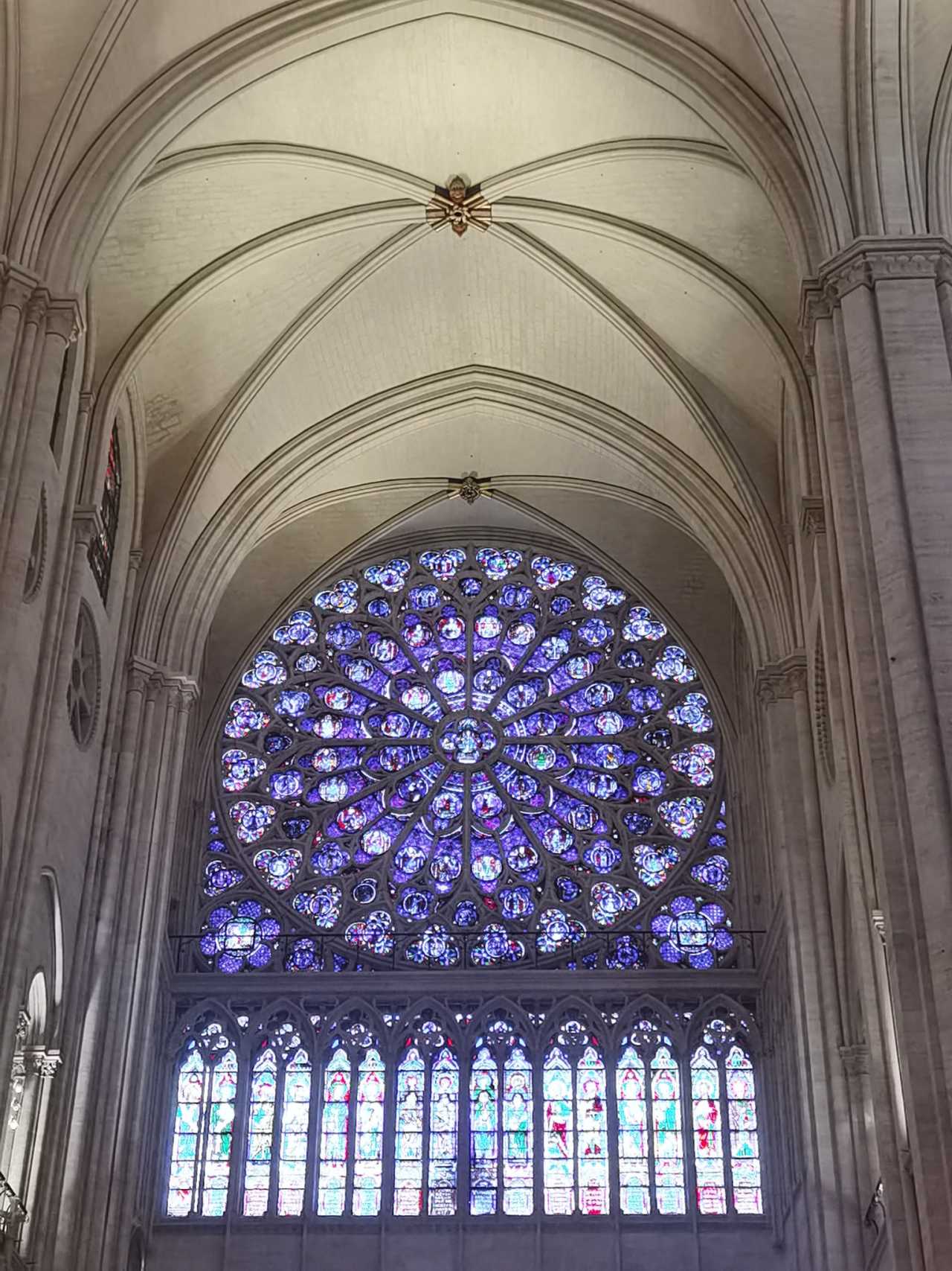 The interior was undergoing renovation, but they turned the barricades into mirrors to reflect the surroundings, softening the impact. On the right in the photo is the reflection of the opposite windows—less obvious in photos. Turn around and look up—behold the rose window!
