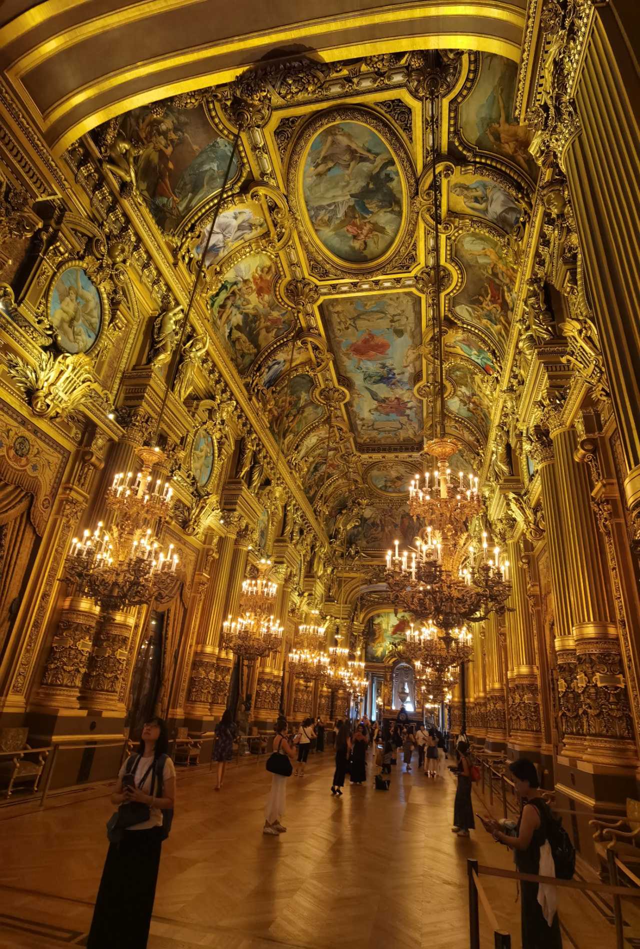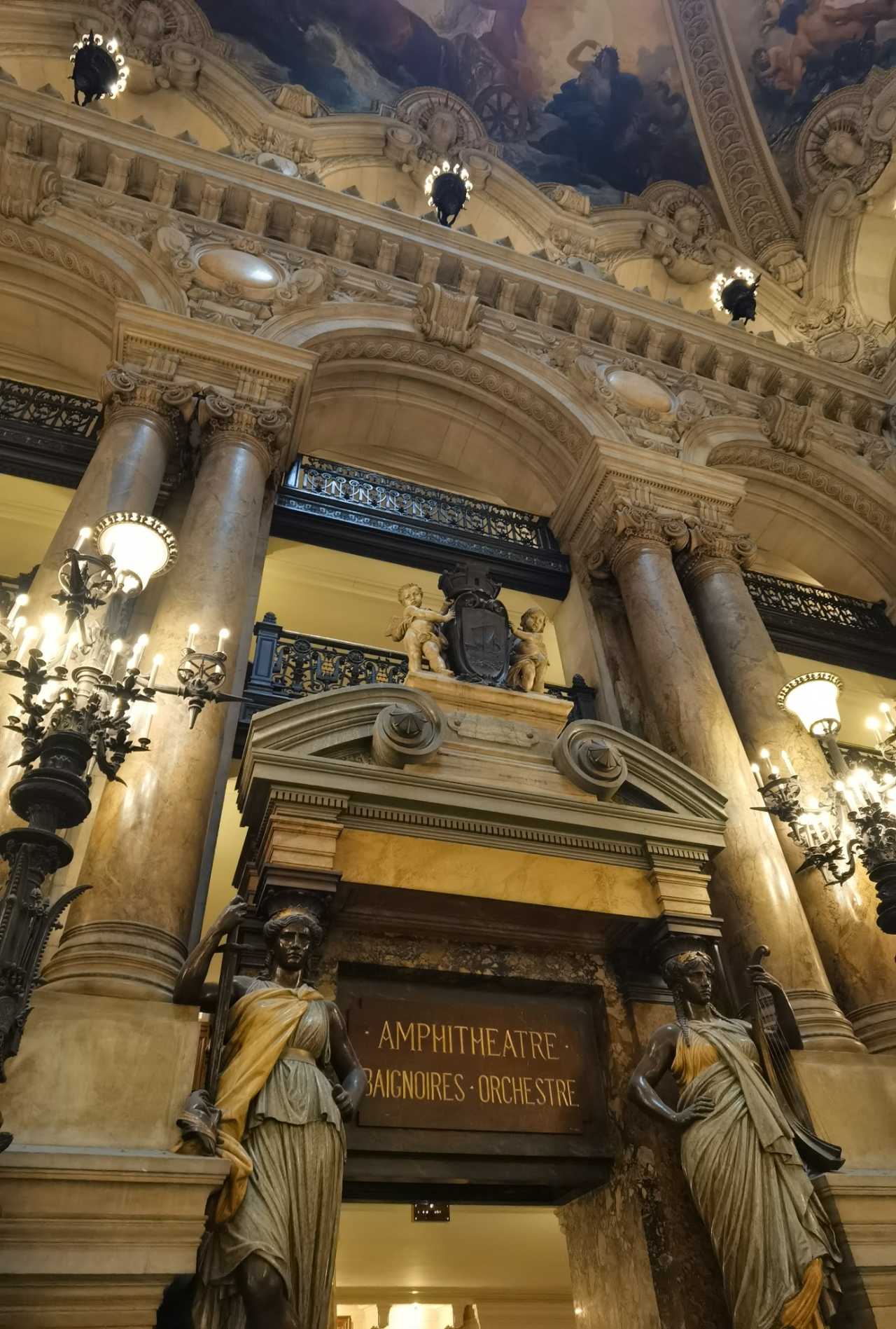The second‑floor boxes are open for visiting. Looking down at the hall—the ceiling is too beautiful.