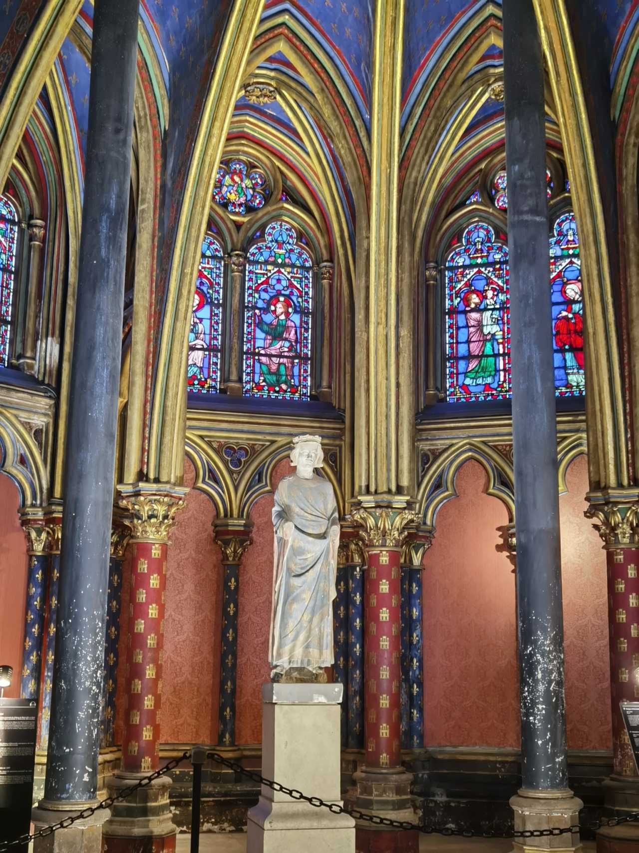 The first floor is striking—stained glass plus large swaths of blue, red, and gold on the inner walls. The visual impact is great. There are also many souvenir shops. Having missed the Notre‑Dame rosette sticker, we couldn’t pass up the Sainte‑Chapelle rose window sticker.