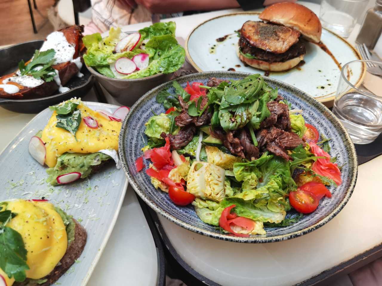 I recommend the foie gras burger and Thai salad. The burger is hefty—juicy with every bite. The Thai salad is refreshingly sweet‑and‑sour, with some beef inside; we didn’t finish it and got it to go. The avocado Benedict comes two per order; after a burger, we couldn’t finish these, but they were good. The truffle fries are fragrant, soft, and very substantial. The sweet potato flavor was a bit subtle—not sweet—and the sauce was even a bit salty? The passion‑fruit‑lemon‑mint smoothie was great! And a funny bit: we ordered two drinks from the handsome waiter, and he even gave us two napkins, but then only put one drink in the order—what a silly handsome guy, hahahaha! We were three at the table with modest appetites—we still had leftovers to take away.