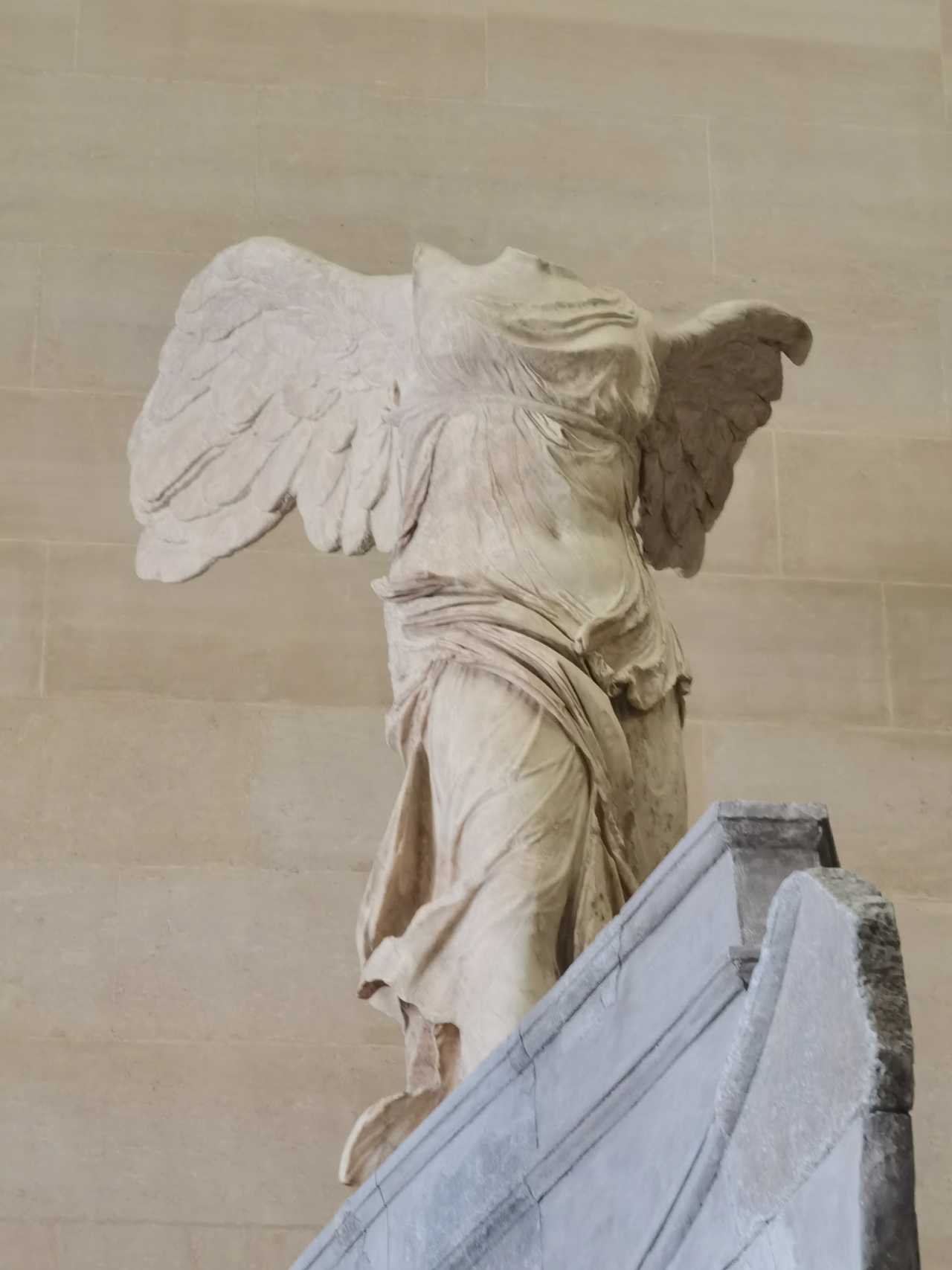 Walk down a long corridor full of sculptures; at the end is the Winged Victory! Powerful from near and far. I like her more than Venus. Follow the signs to find Mona Lisa—the signage is clear. We detoured slightly to see more.