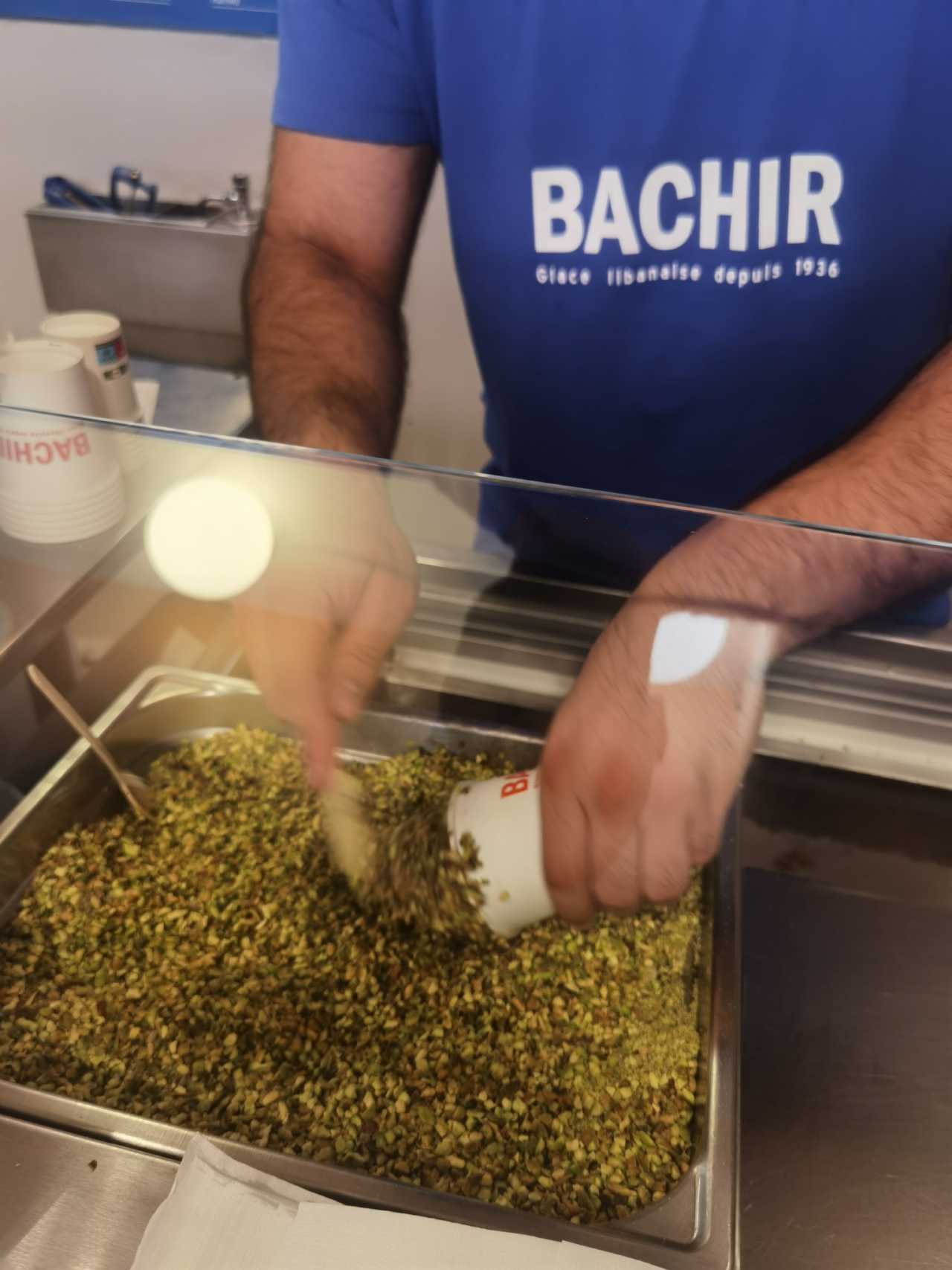 Precisely because we detoured to Pompidou, we accidentally found a gelato shop with a long queue—BACHIR. While queuing, staff came to introduce and offer tastings; you mark your selections on a menu first. When it was our turn, the guy was super enthusiastic—asked if we wanted more flavors, whipped cream, and praised our choice of cups as “clever” hhhhh (we’d seen lots of cones melting into a mess). We initially thought you could only choose one flavor; after his enthusiastic recommendations, in addition to their signature milk we added chocolate. He packed several big scoops, then kept flipping and rolled a thick ring of pistachio crumbs around it. A heavy one in hand—enough for three to share~