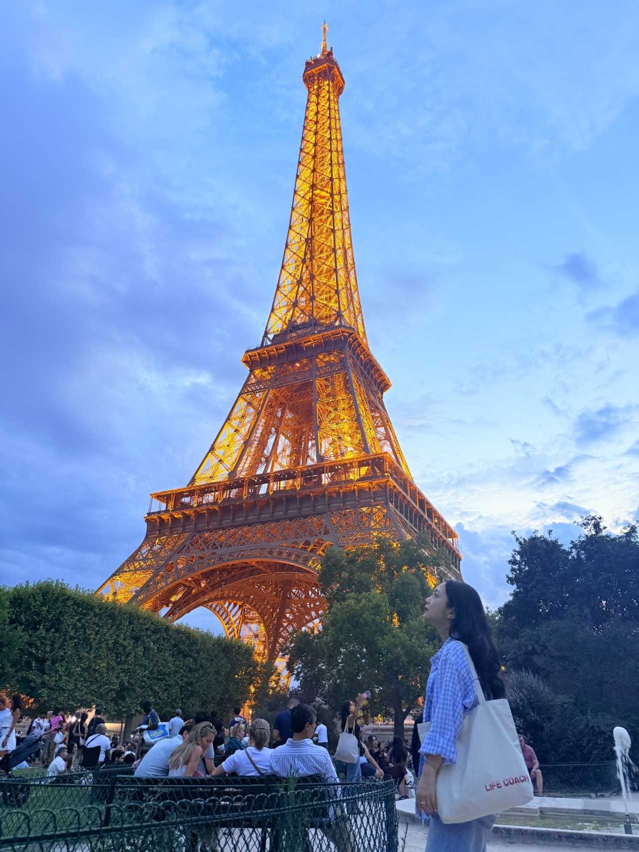 Today wasn’t too tiring, so we decided to watch the Eiffel Tower lights. Lights at 10 pm. We strolled over slowly—post‑dinner walk.