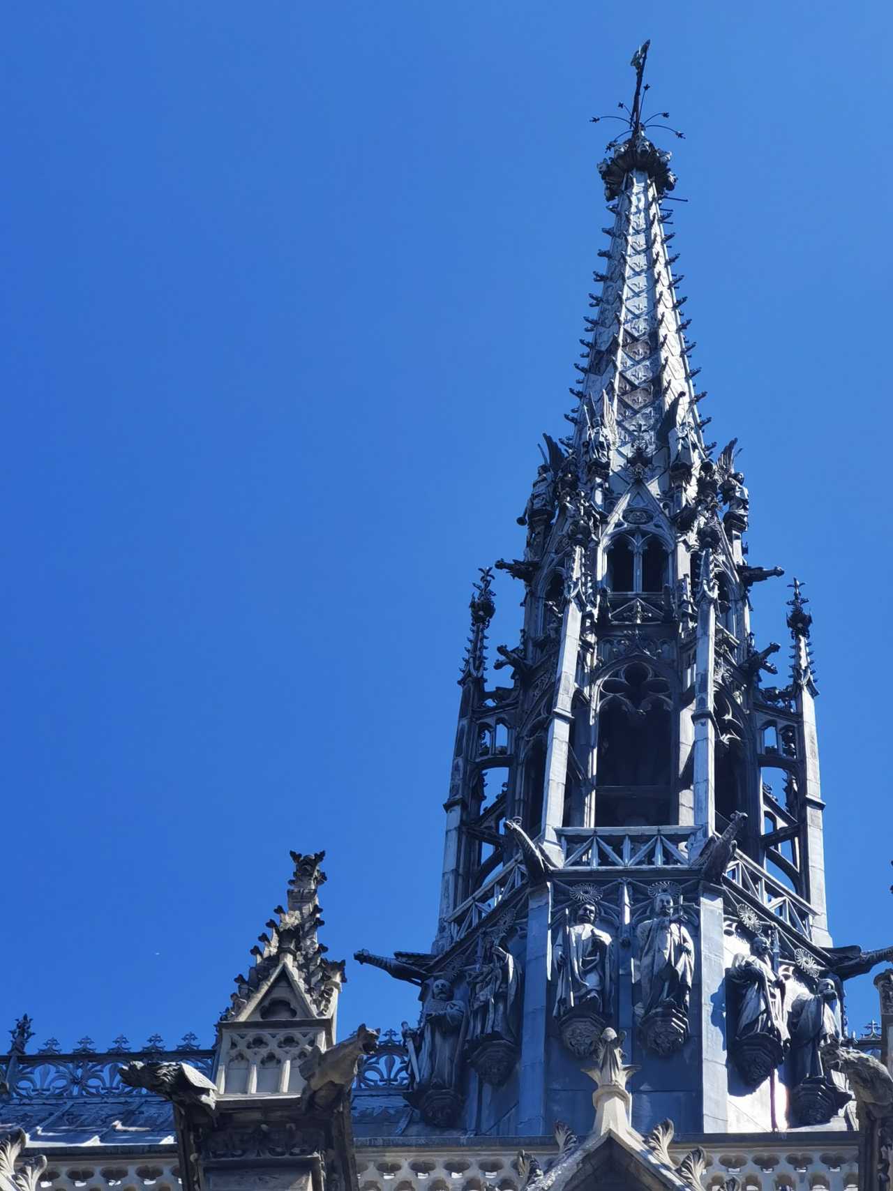 It happened to be Sunday. Early in the morning we crossed to the other bank to visit Notre‑Dame. We could see its spire tip from our Airbnb balcony (the listing used this as a selling point; a teammate searched for a long time and only saw a tip—well, you can say you can “see” it, I guess).