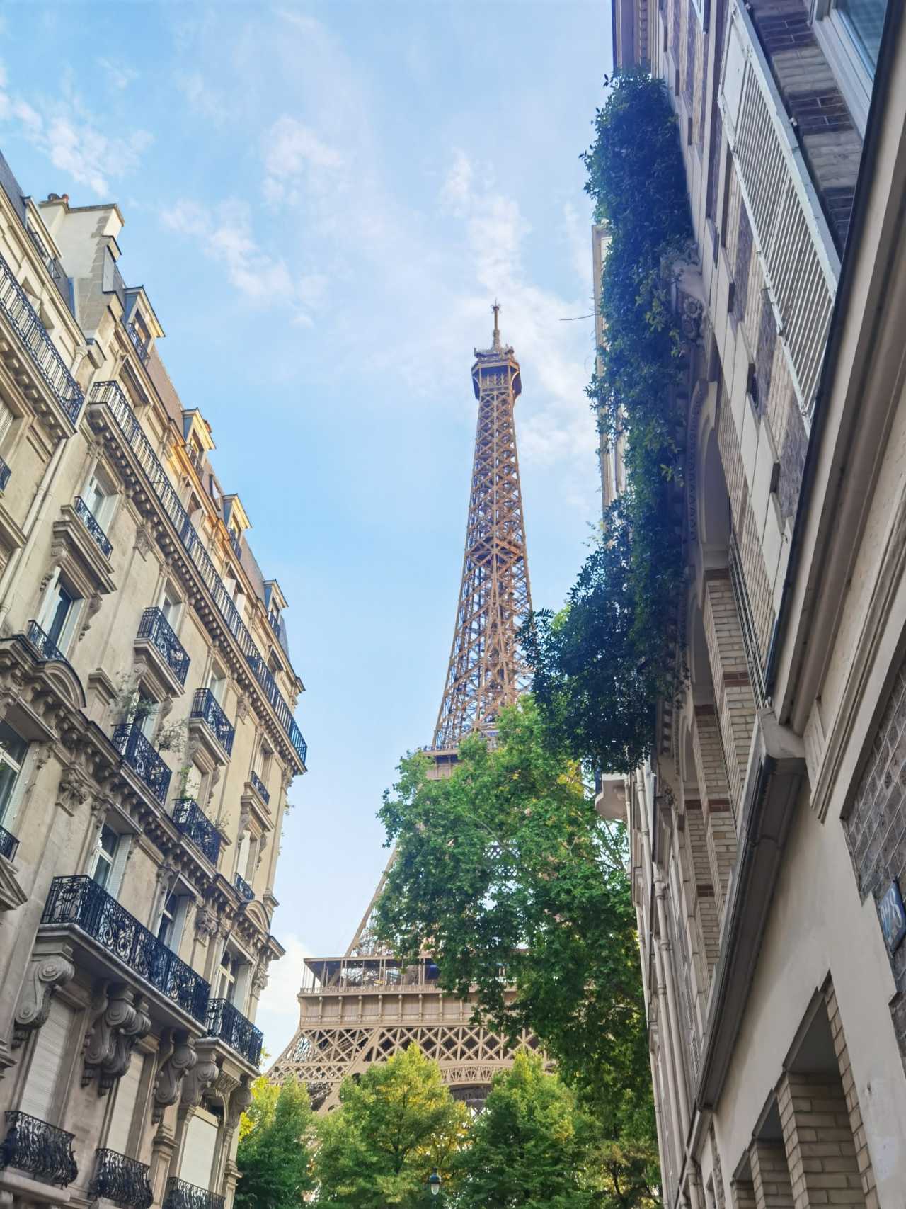 I think the view from this street corner is particularly French—the buildings on both sides, greenery on the window sills, and the soaring tower. Lots of people take photos here.