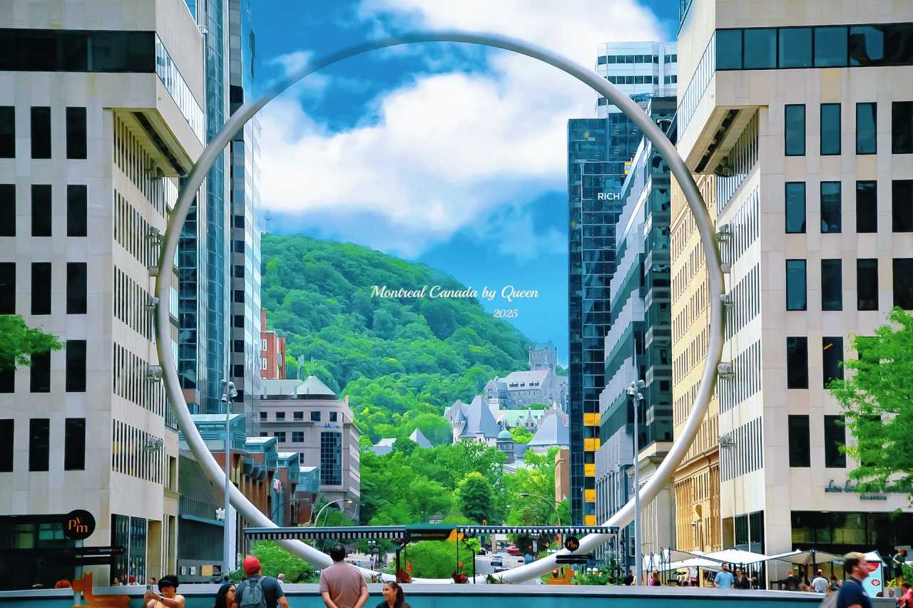 Among these buildings, there is also one of Montreal’s most eye-catching new landmarks – The Ring. A huge metal ring with a diameter of 30 meters, suspended in the air, installed in the Esplanade Place Ville Marie square in the city center, designed by the local art institution Moment Factory. The Ring doesn’t have too many decorations, just a clean, minimalist geometric circle, but it creates a visual pause and blank space between the city’s high-rise buildings.