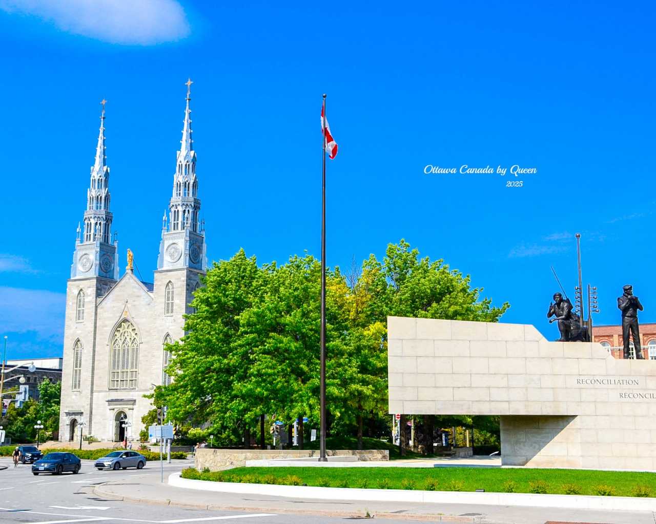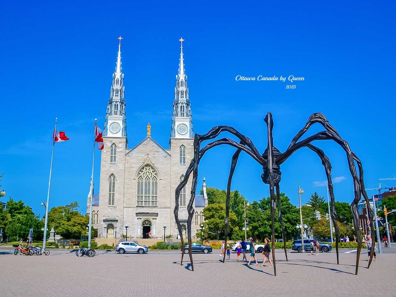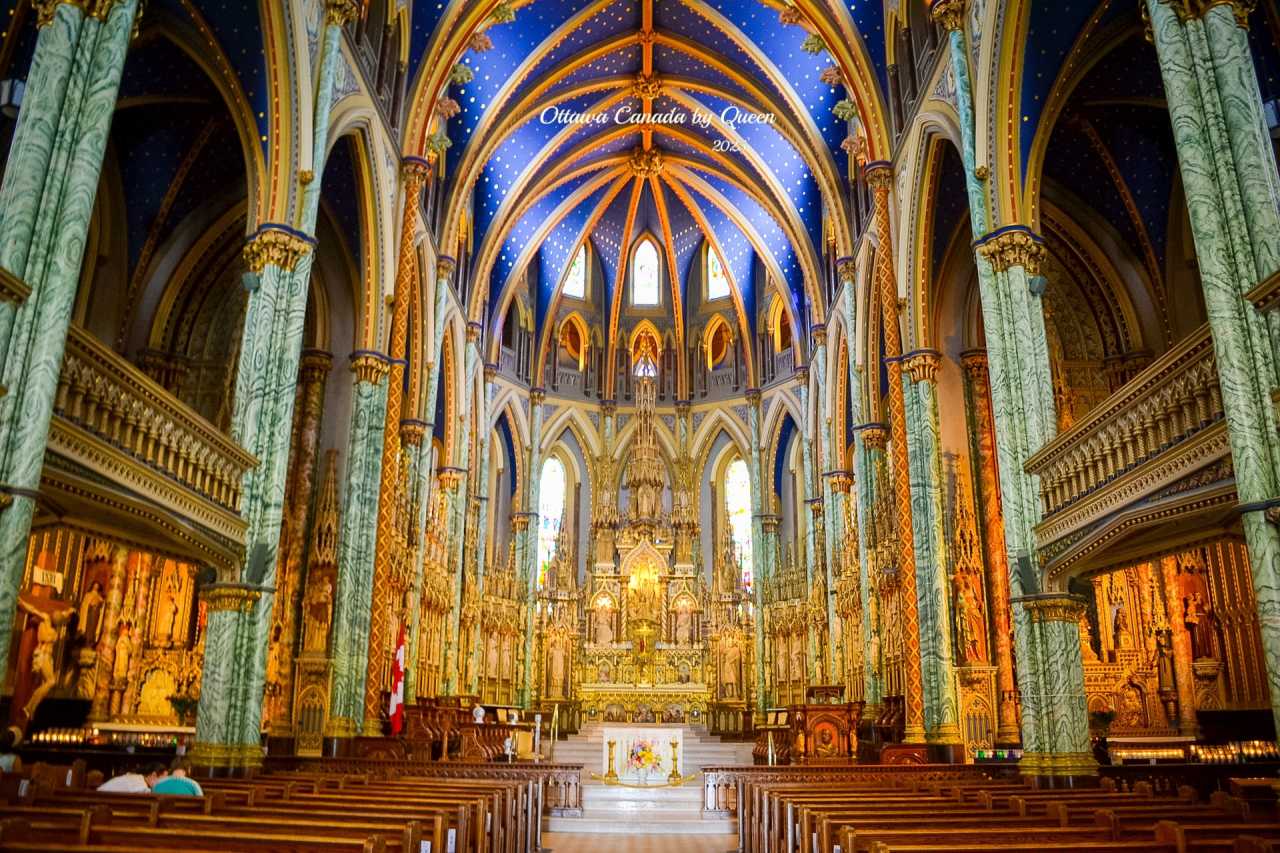 Walking across from the spider’s shadow, one’s gaze is involuntarily drawn to another landmark – Ottawa’s oldest and most solemn church: Notre-Dame Cathedral Basilica. Her twin towers shimmer with silver light under the sun, with Gothic spires, rose windows, and blue-gold interior ceiling, exuding an almost gentle sense of sanctity.