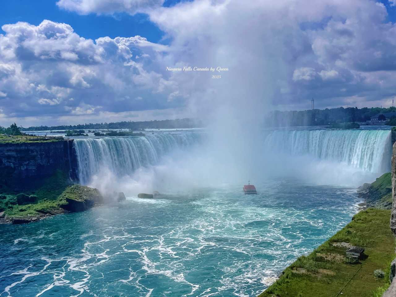 Driving along the QEW highway was smooth all the way. When we arrived at Niagara town, we could already feel a bit of “tourist area atmosphere” – tourists, sightseeing buses, helicopters circling in the sky, and the sound of water coming from afar. The moment the waterfall appeared before my eyes, I had a wow moment. Not because of how “tall” it was (actually it’s not particularly tall), but because of the shock brought by the water flow. Tons of water poured down from the cliff, with a rumbling sound like nature roaring, but it somehow made people feel inexplicably at ease.