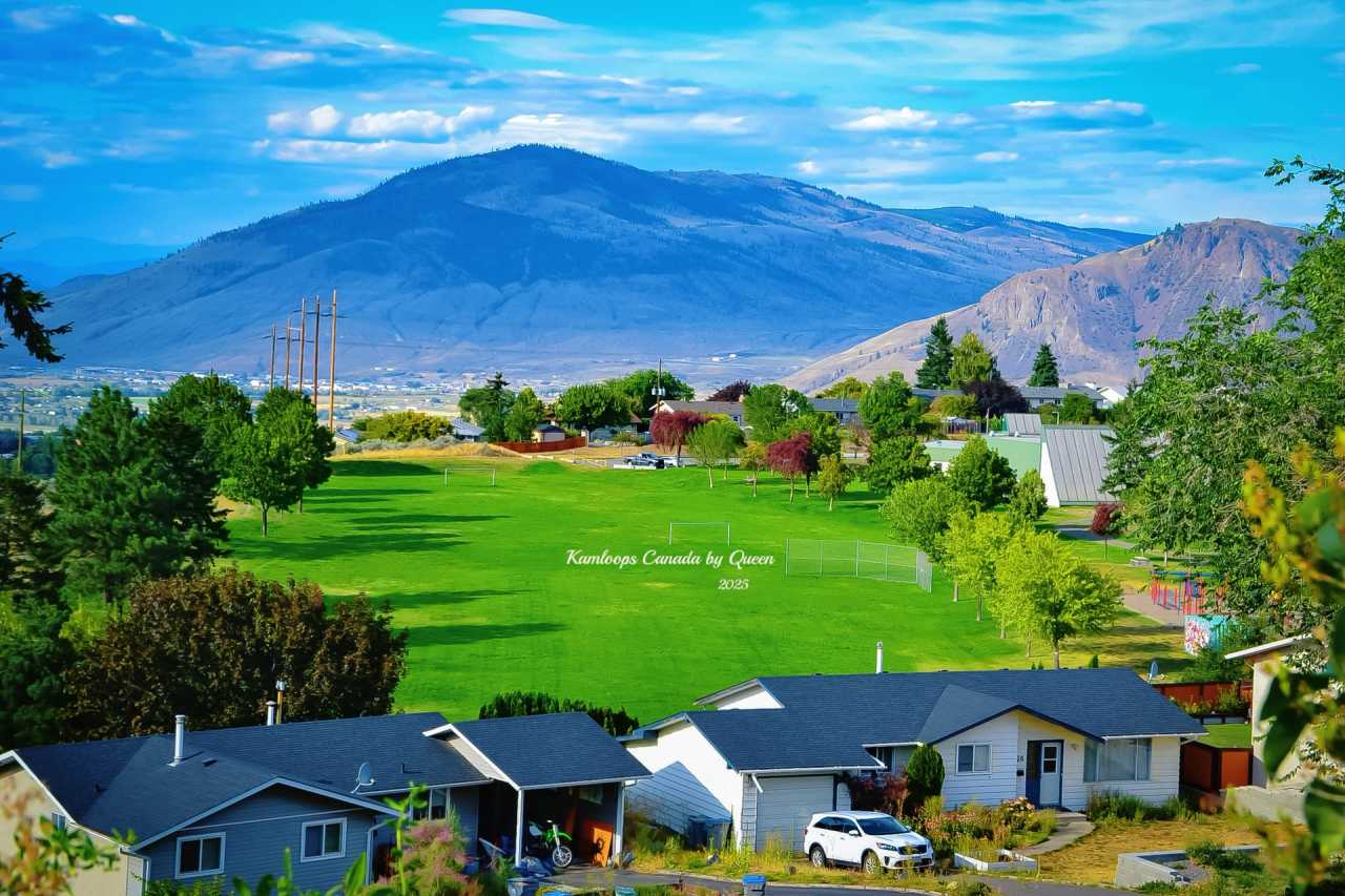 Kamloops is the “Sunshine City” of British Columbia. I didn’t go into the city to check in, just rested in the hillside villa area outside the city. In the evening, sunlight falls from the west, the entire community is quiet and tidy, with gardens and neat lawns in front of the houses exuding a leisurely life atmosphere. Standing at the top of the slope looking out, the whole Kamloops unfolds: the winding river like a silver belt flows through the city, and the valley glows with a soft golden pink in the sunset.
