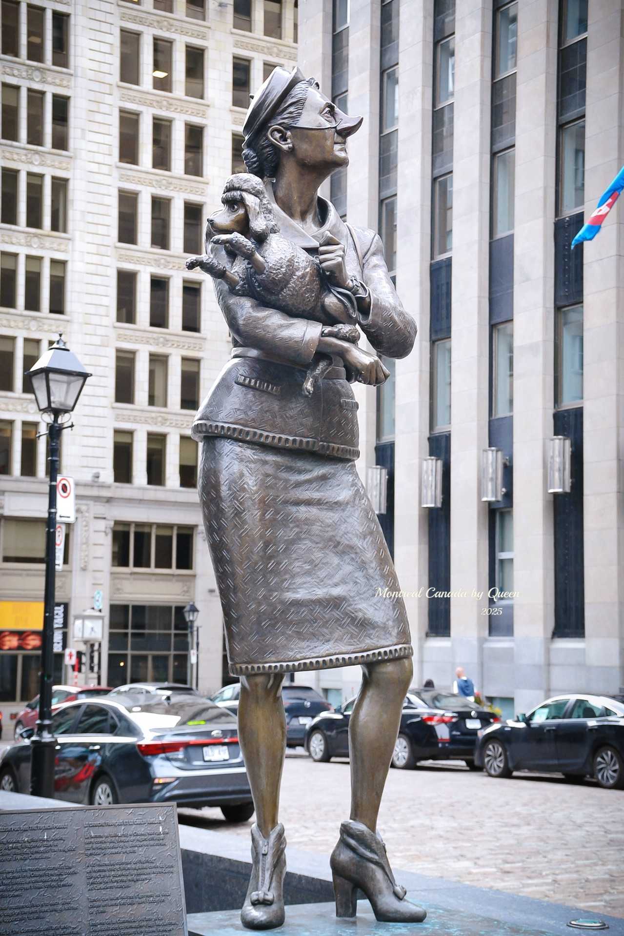 In front of the cathedral in Place d’Armes, there are two masked men holding dogs, part of a group of six realistic bronze figures created by Fortier, representing ordinary citizens of Montreal in different eras, vivid and lifelike.