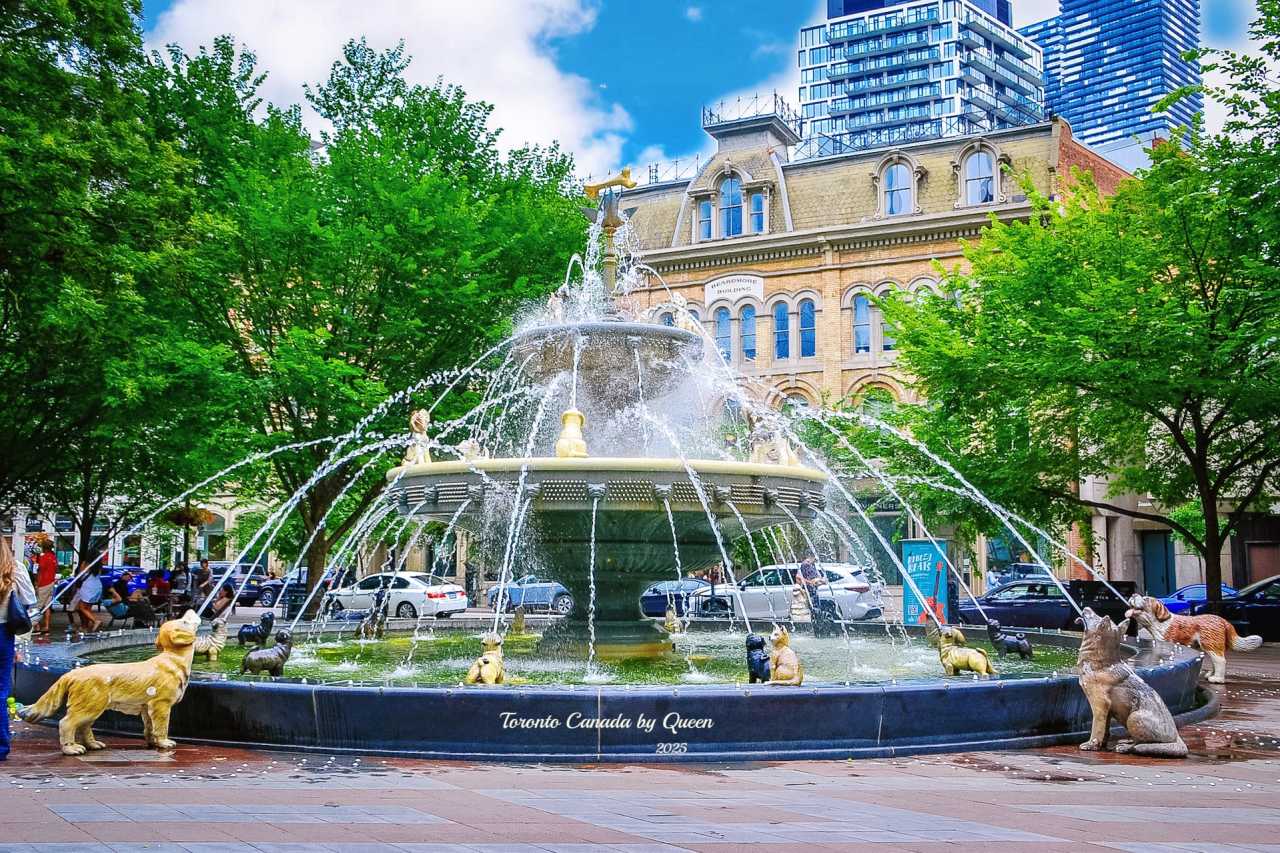 Walking a few steps further south, I came to an unexpected corner – Berczy Park. This is a small street-side park, but it has the cutest fountain in the whole city. Dozens of dog statues in various poses surround the central water column in a circle, some jumping, some looking up, some tilting their heads and acting cute, all eyes focused on the golden “bone” in the middle. The dogs really spray water from their mouths, looking like they are joyfully chasing. No matter how bad your mood is, seeing this fountain will make you unconsciously smile. The seriousness of the city is completely dissolved here, replaced by a childlike sense of humor.