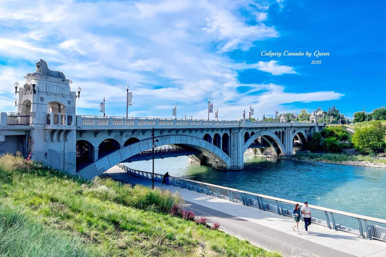 After eating and drinking, I came to the riverside walkway next to the city center and saw a white arch bridge spanning the Bow River – the Centre Street Bridge. This important traffic bridge was built in 1916 and is one of Calgary’s cultural symbols. The bridge body is elegant, with white concrete structure carrying classical carvings, as if time has frozen here.