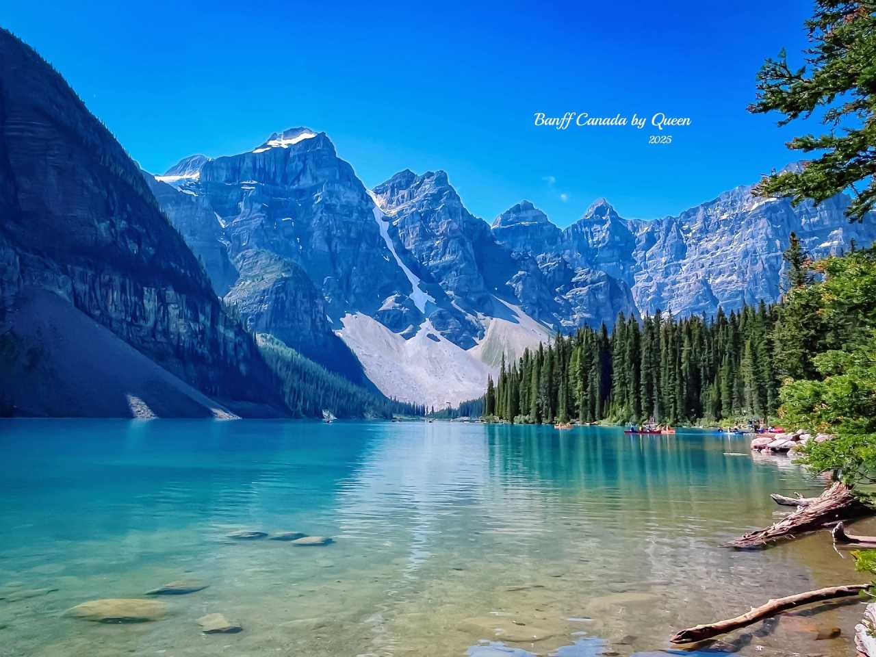 When reaching the mountaintop, that moment really takes your breath away. The lake water is unrealistically blue, that rich sapphire blue, like colors blended by snow mountains and sunlight, carrying the clarity after glacier melt, yet more transparent than any filter. The lake surface is as still as a mirror, reflecting the silhouette of Valley of the Ten Peaks, as if only mountains, water and silence remain in this world.