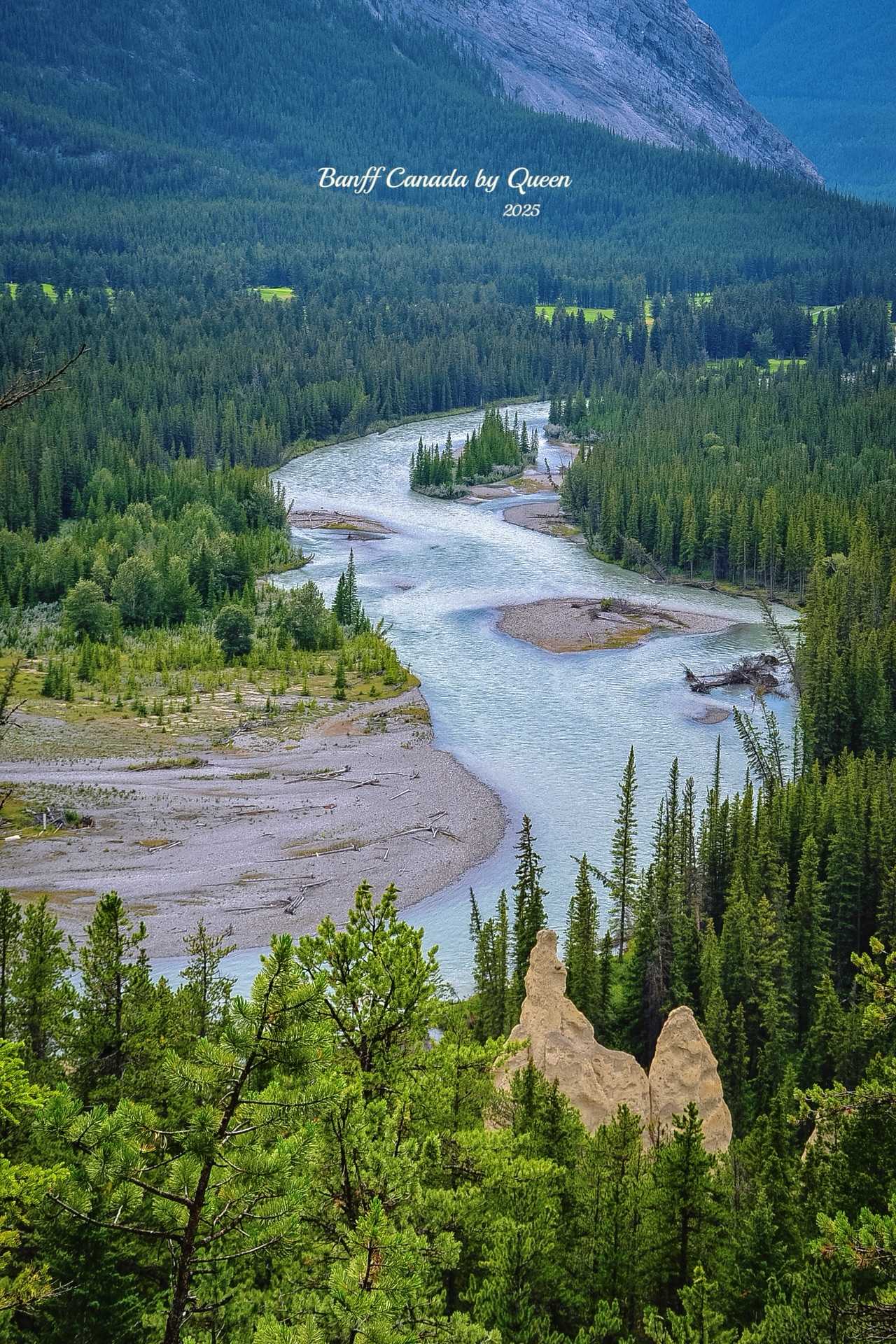 Shot the classic distant view of Fairmont Banff Springs Hotel from the Bow Falls trail. This hotel is one of Banff’s most representative and legendary landmarks. Called “The Castle in the Rockies,” she stands quietly on the hillside like a castle in a fairy tale, surrounded by pine forests, overlooking Bow River and the entire Banff valley.
