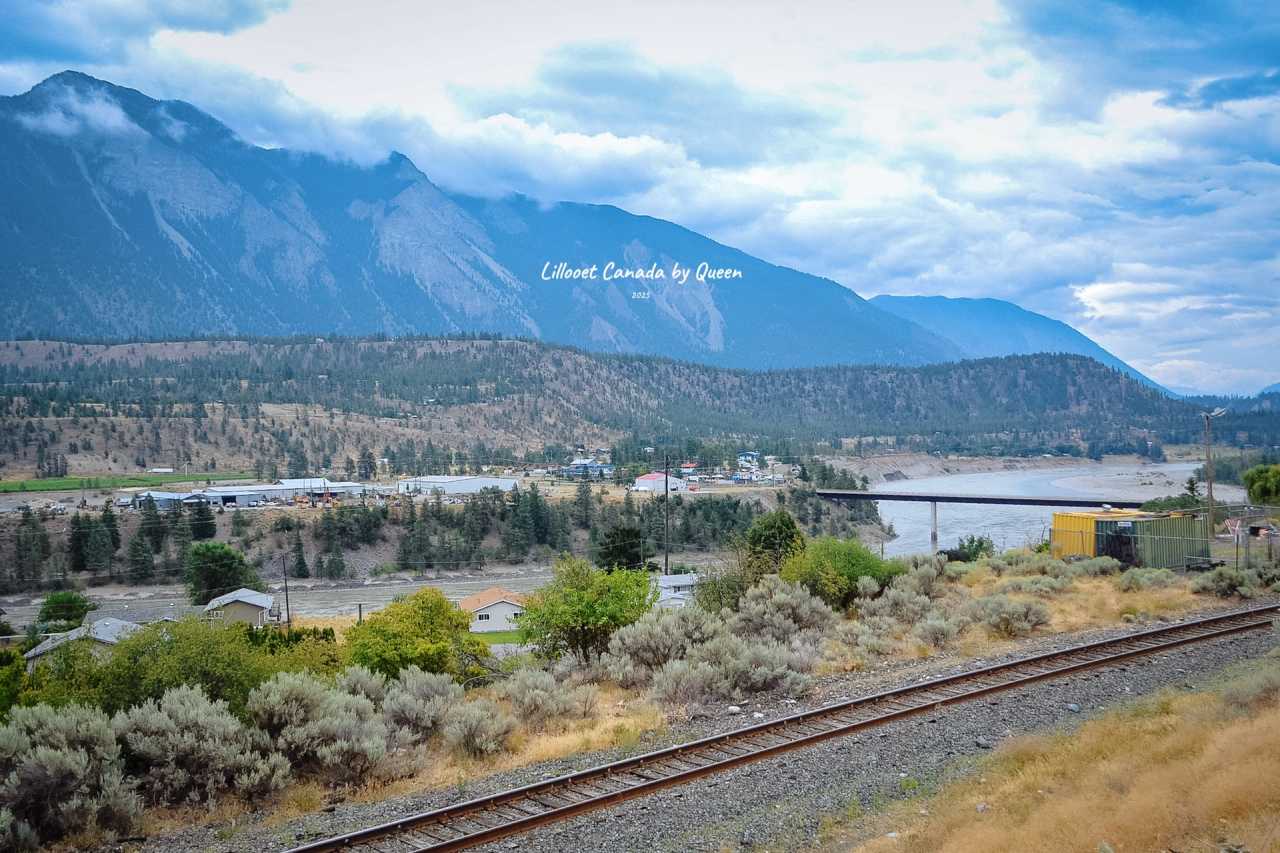 Further south, the climate suddenly becomes warm and dry, with vineyards and fruit trees even visible on the slopes – an unexpected semi-arid landscape. When passing through the town of Lillooet, surrounded by mountains, the air carries a dry coolness. The streets are surprisingly quiet, almost no pedestrians, occasionally a car slowly drives by. Lillooet is a small town located on the banks of Fraser River in BC province, surrounded by mountains and steep canyons, with magnificent scenery all around. It was once an important stronghold of the gold rush and also a place where indigenous and railway history intertwine.