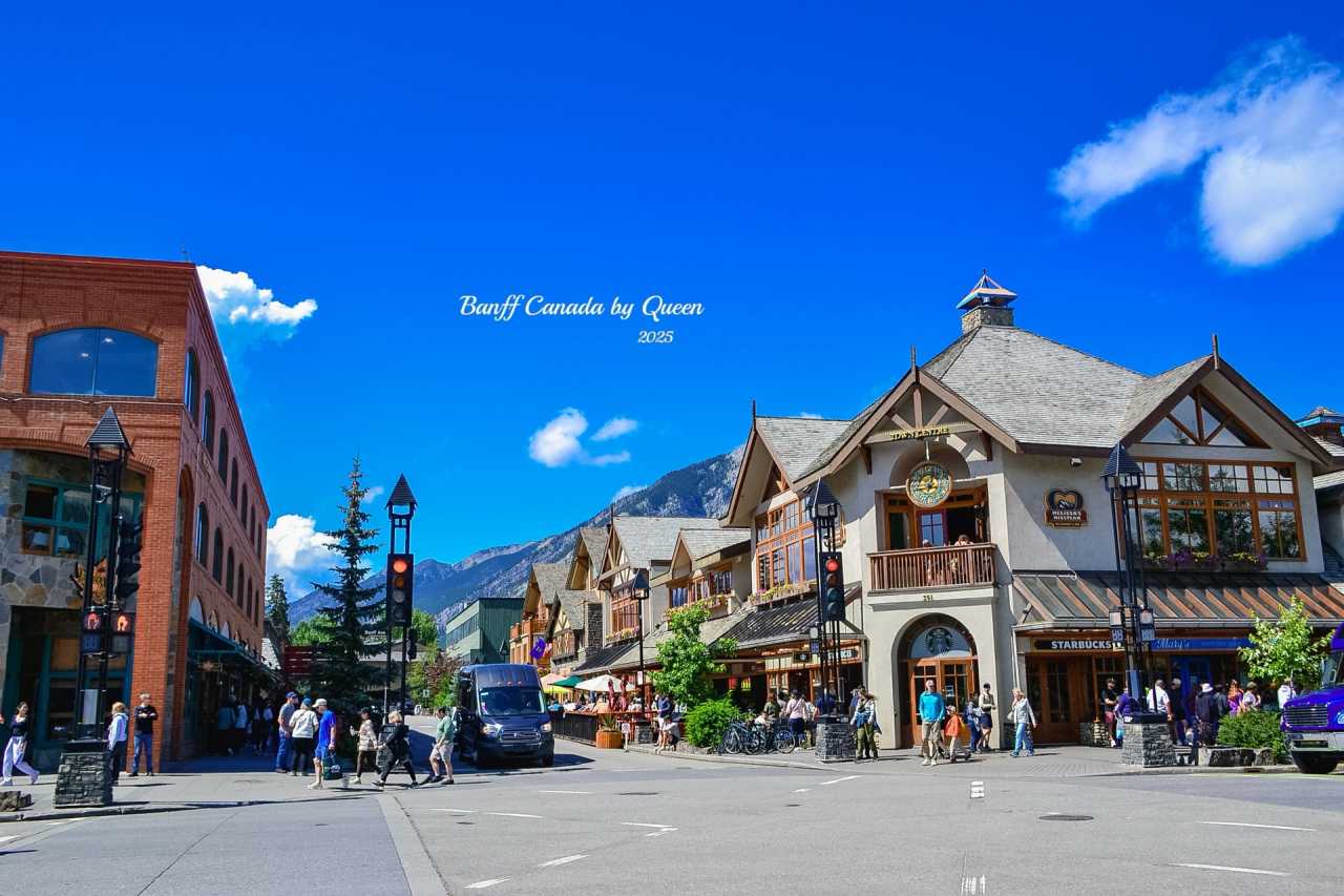 Banff town center is like a small street nestled in the embrace of mountains, just a few hundred meters long, but condensing all the expectations and romance of travelers. Both sides of the street are neat wooden house-style buildings, with slanted roofs and flower-decorated window frames, like a fairy tale mountain town. No matter which intersection you stand at, looking up you see layers of snow mountain backgrounds, majestic yet not overwhelming.