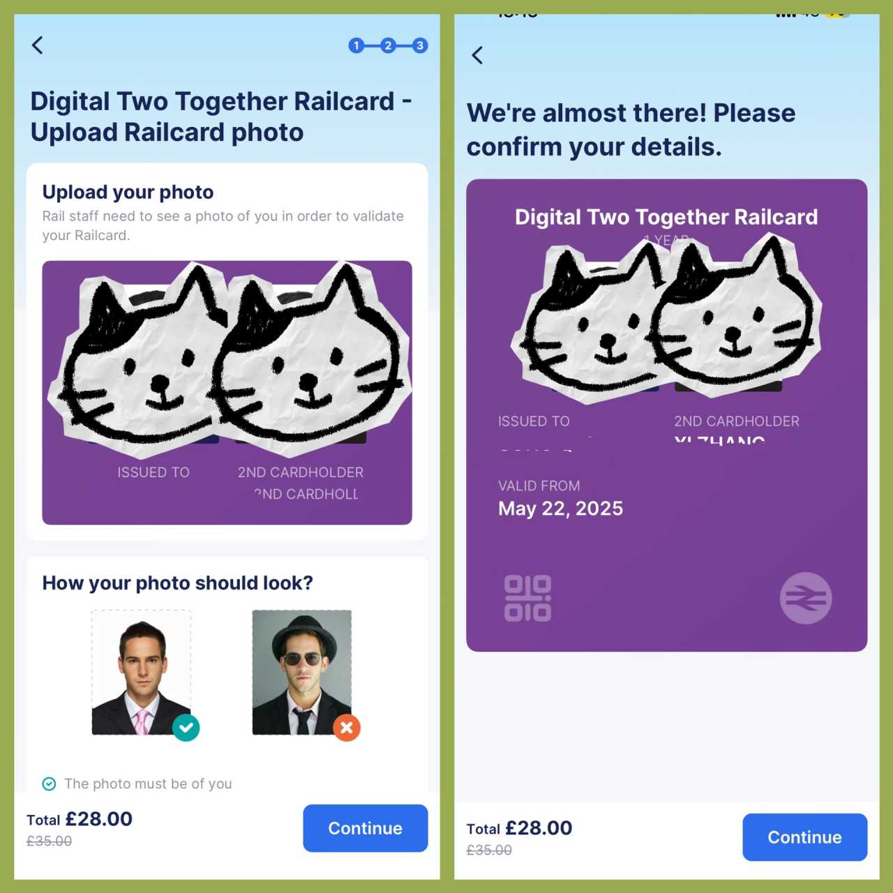Buying a 2-person Railcard requires uploading two ID photos, and it generates an image with both photos and a QR code. On the train, staff scan the QR code at the bottom-left of the image.