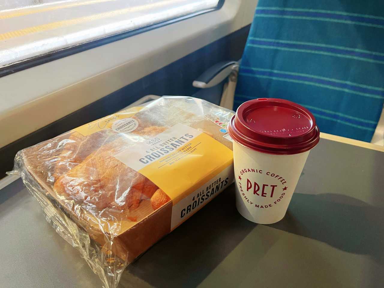 King’s Cross StationBreakfast on the train: coffee plus a croissant from Marks & Spencer (among many grocer croissants, I think M&S’s are the best~)