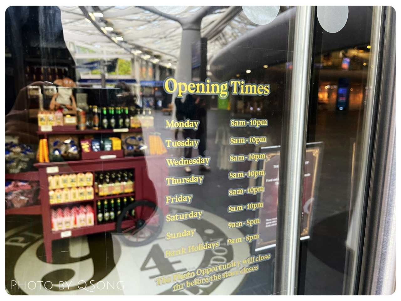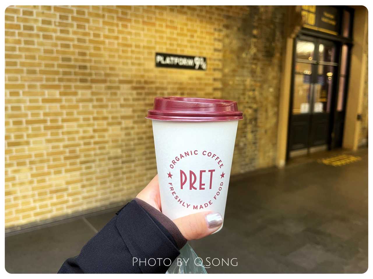 King’s Cross StationOur train was early, so we planned to have breakfast onboard. At Pret A Manger, I bought a latte for £4. With few people at the 9¾ shop, we quickly checked in—no trolley prop, but the wall logo was fine.