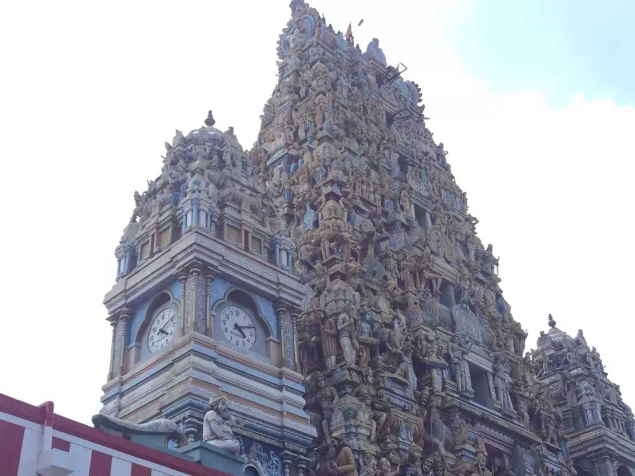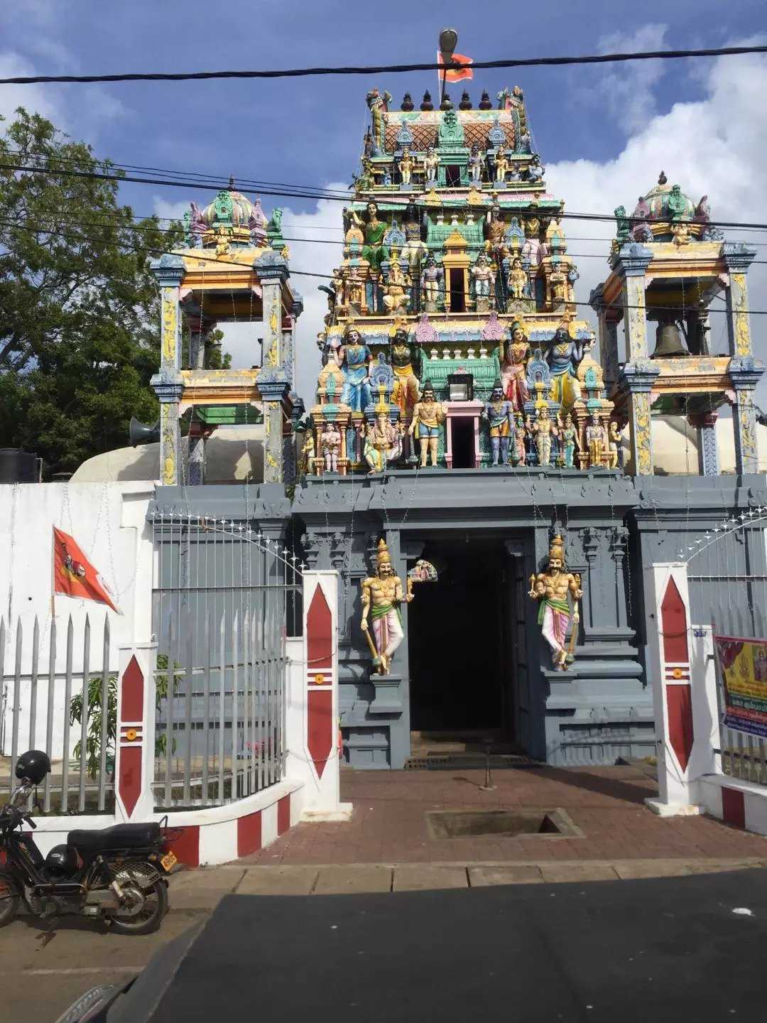 We visited a colorful Hindu temple—a glimpse of Sri Lanka’s most down‑to‑earth side; when we arrived, it was under repair. The old and new temples stand side by side on Sea Street, dedicated to Murugan, the warrior son of Shiva. Entrances are adorned with numerous finely crafted Hindu deities; above the central gate six green dragons support the lintel. Beside them is a Ganesh temple. With basic understanding of Hinduism you gain more from the visit: outwardly it has countless deities, yet many devotees primarily worship one supreme being. The three principal deities are Brahma (creator), Vishnu (preserver, protector), and Shiva (destroyer, often symbolized by the lingam, appearing in many forms). Hindu society is structured by caste with Brahmins at the top; doctrine emphasizes karma and rebirth, ritual and asceticism, and reverence for the Vedas.