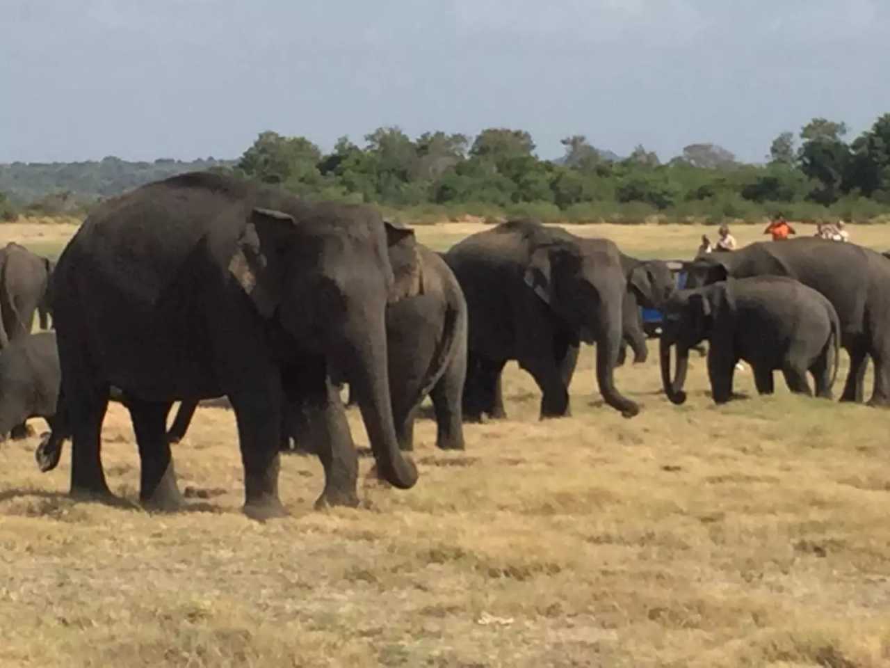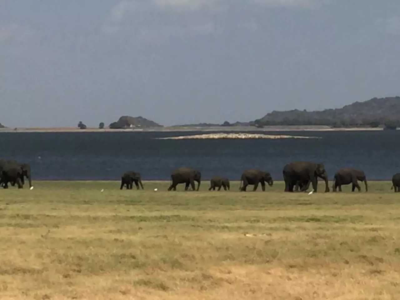 Next we visited Minneriya National Park (90 km²). The great reservoir built by a 3rd‑century king exposes grasslands in the dry season, drawing macaques, sambar, Sri Lankan leopards, and flocks of birds like little cormorants and painted storks. Elephant herds migrate here from Matale, Polonnaruwa, and Trincomalee—wildlife heaven. We entered by open‑top jeeps, six per vehicle, bouncing toward the lake. Through forest we reached a vast savanna; the lakeshore was black with hundreds of wild elephants, feeding, bathing, and playing. Our luck was incredible—to see so many. Jeeps circled the lake, waterbirds gathered everywhere. We stopped within about 100 meters of a group of roughly fifty elephants—calm despite a few jeeps nearby. Parents guarded their adorable calves who nuzzled and played. I was fascinated by how they fed: kicking clumps loose with a forefoot, curling trunks to bundle grass, then lifting it to the mouth. Forest, grass, water, and sky—this whole place is their world. It was my first time so close to wild elephants; we shot lots of photos before reluctantly leaving. That night we stayed in a tented camp, with ample space between tents and excellent facilities—sit at the doorway and enjoy the view.