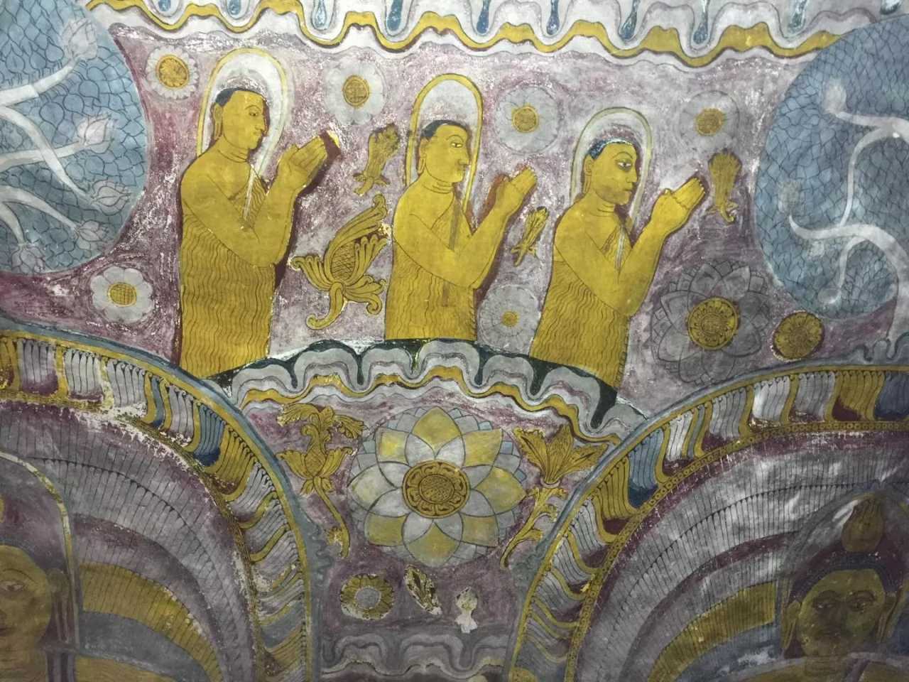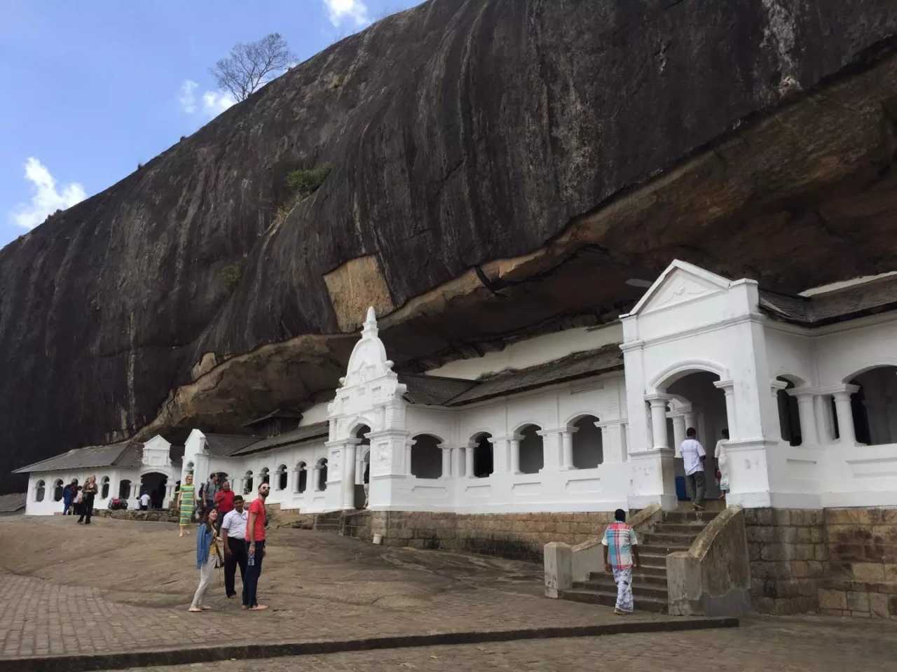 Monday, Sept 12: we set out at 10:00 for the Dambulla Cave Temple. In Buddhist temples you must remove shoes and hats, keep shoulders and knees covered, and never step on, straddle, or climb over Buddha images. There is a shoe deposit at the gate—25 LKR per pair, no change given. Dambulla sits in central Sri Lanka, 149 km northeast of Colombo and about 60 km north of Kandy. The cave temple, founded in the 1st century BCE, is a major pilgrimage site, carved into a giant rock south of Dambulla town, with over 2,000 years of history. It is Sri Lanka’s best‑preserved cave temple complex, famed for murals and statues. The complex comprises five shrines. Cave 1 houses a 14‑meter reclining Buddha with Ananda at his feet and an image of Vishnu above the head—hence it is called the “Devaraja Lena.” Cave 2, the largest, contains 16 standing Buddhas, 40 seated Buddhas, two Hindu deities (Vishnu and Saman), and statues of kings Vattagamani and Nissanka Malla; a small stupa stands within. A spring in the cave strangely appears to flow upward along a fissure and drips day and night—believers call it sacred water. Cave 3, the “Maha Alut Viharaya,” features 17th‑century Kandyan‑style paintings and a statue of King Kirti Sri Rajasinha (1747–1782), who revived Buddhism. Cave 4 is smaller, with a single seated Buddha; its stupa was once looted. Cave 5 was a storeroom and now holds a giant reclining Buddha with many Hindu deities beside him. The murals are extraordinary—geometric patterns on the ceilings and richly colored walls—most in excellent condition.