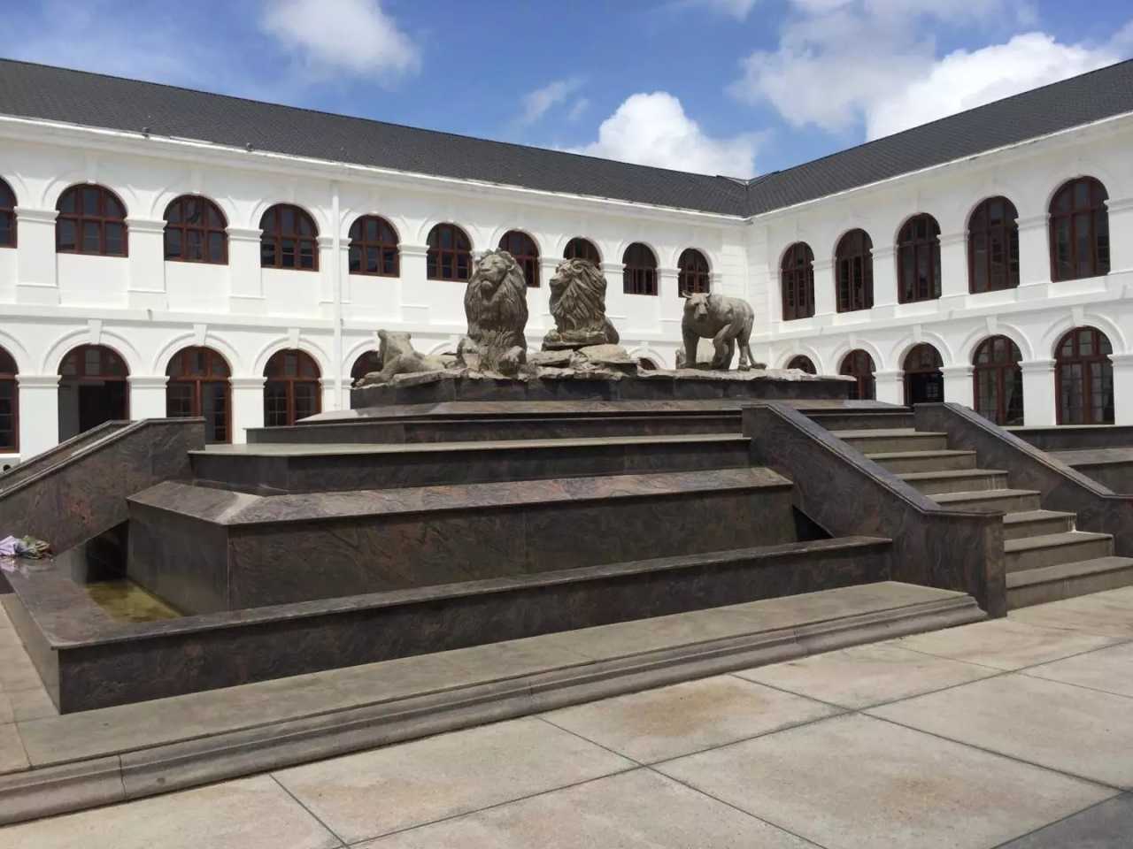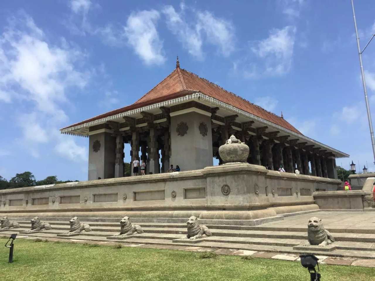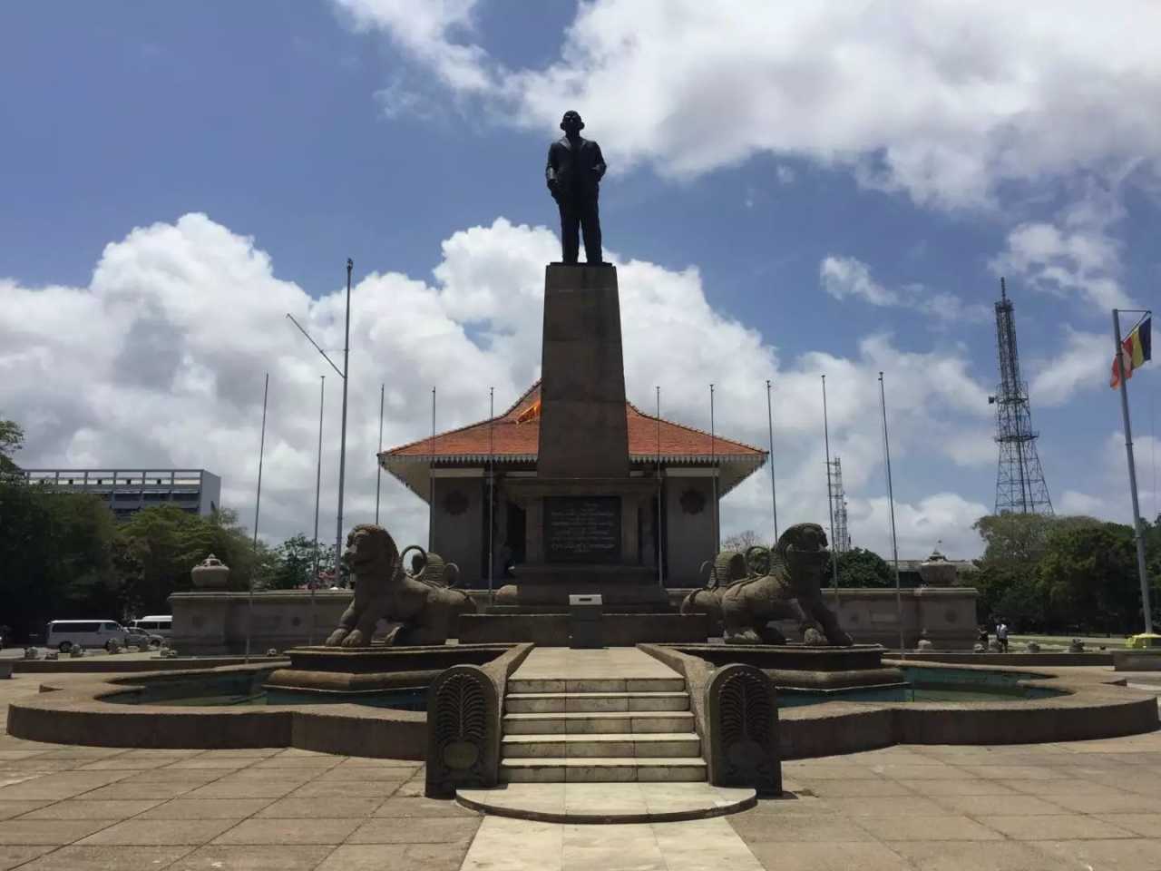 Next: Independence Square, east of the University of Colombo, an iconic cultural plaza where the independence ceremony was held on February 4, 1948. From here you can glimpse the white City Hall and see flags flying to the west. Many young people rest and read here—a pleasant, quiet spot. On the memorial hall’s beams and columns you’ll see carvings of elephants, lions, and scenes from Sri Lankan Buddhist history. Art students practice sketching; around the hall are 60 stone lions symbolizing the Sinhalese, each representing a king in the Kandyan style. The central Independence Memorial Hall echoes the royal audience hall of the Kandyan era. Fountains play at night; green lawns surround the monument, framed by stone lions. On the back stands the statue of D. S. Senanayake, Sri Lanka’s first prime minister.