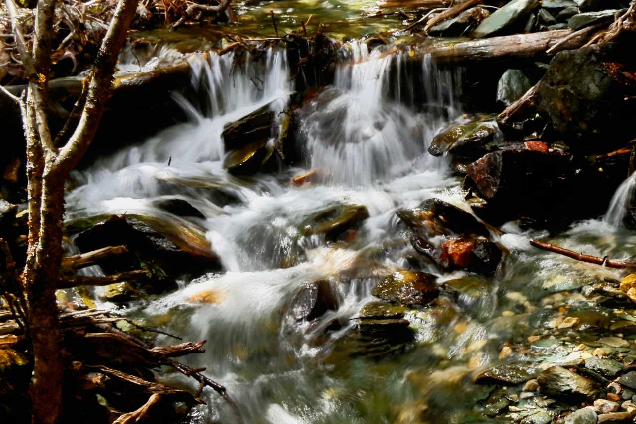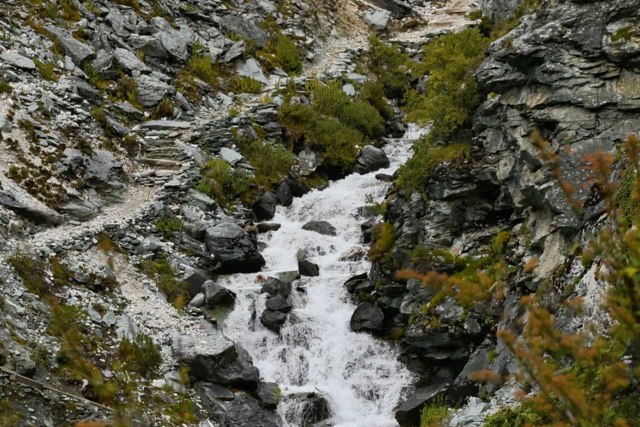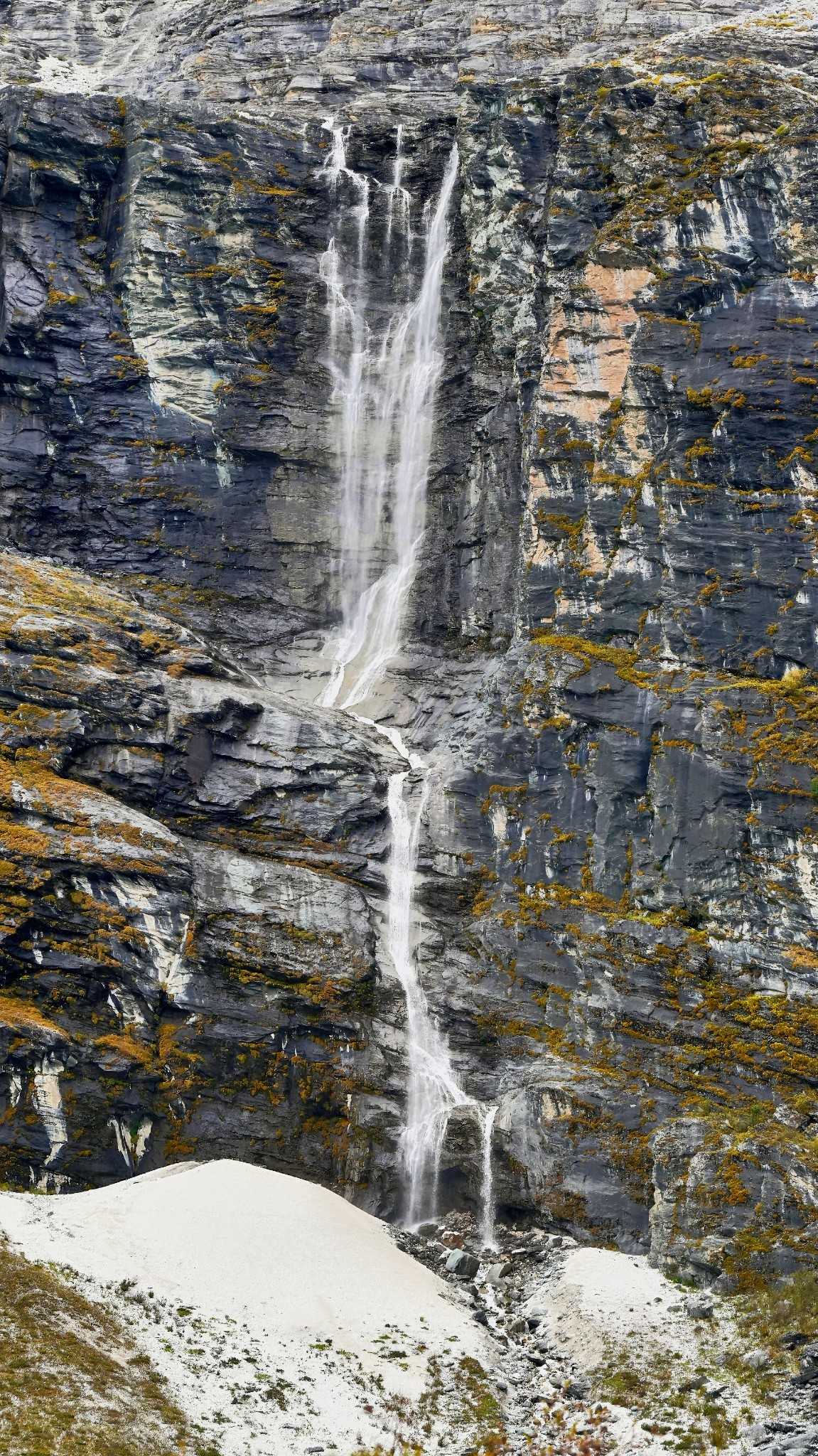 Glacial meltwater rushes down like silver silk meandering across the meadow.