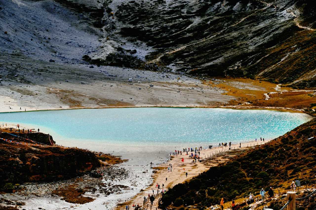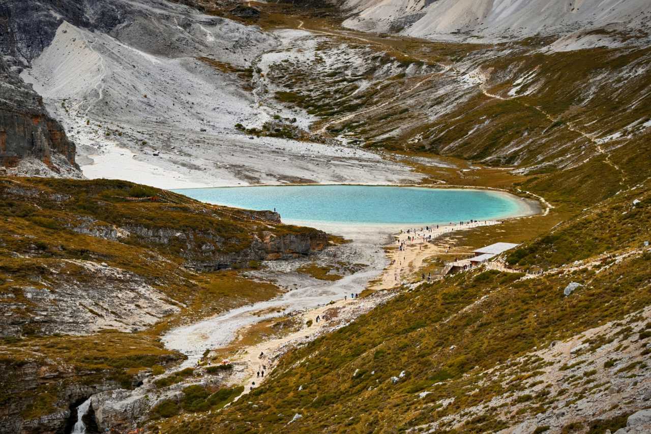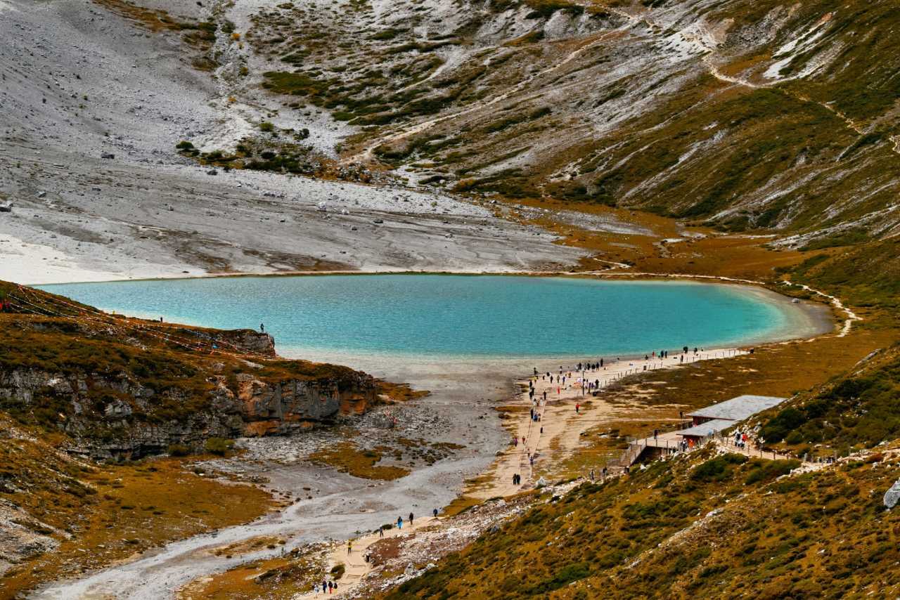Milk SeaOn the way to Five-Color Lake, be sure to look back—the Milk Sea becomes a palm-sized sapphire set among brown ridges and yellow-green bands—a grand reward for the climb.