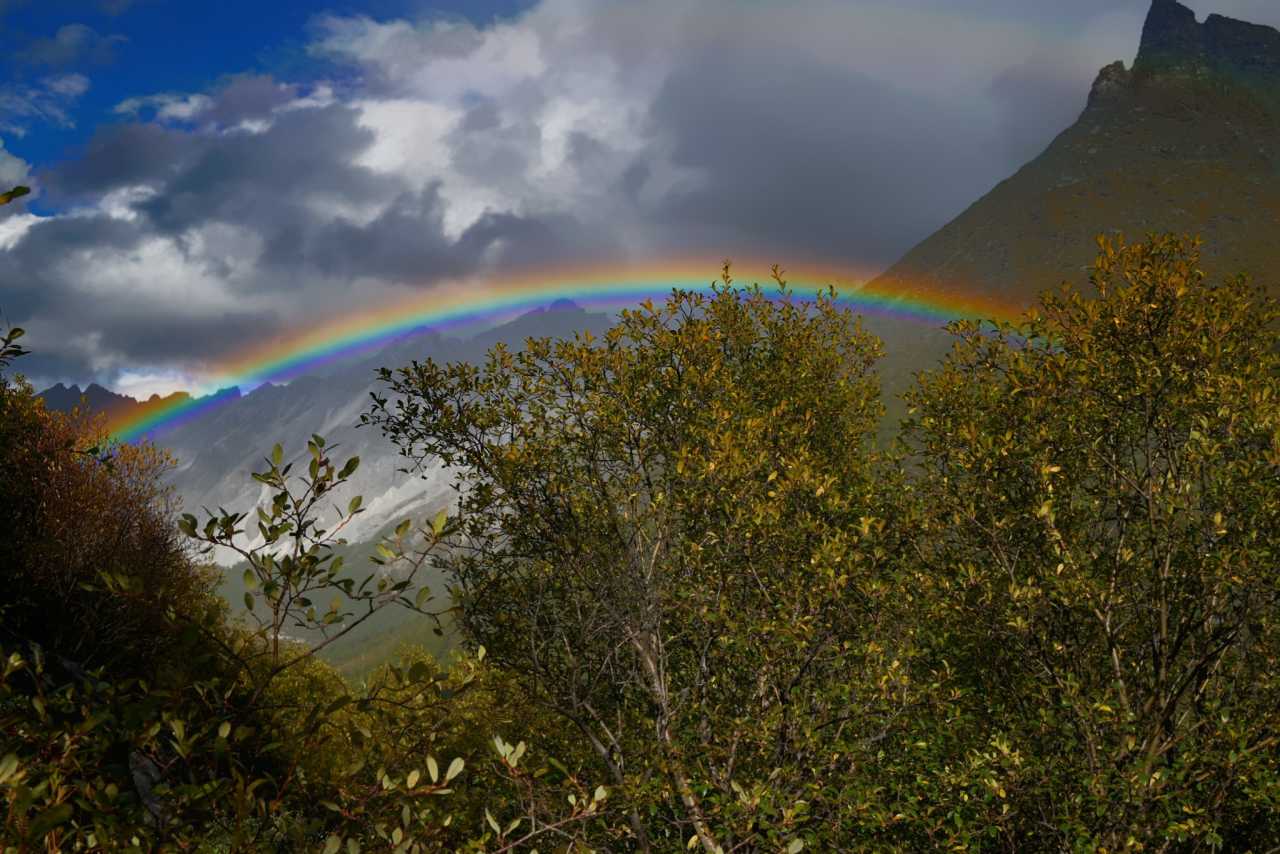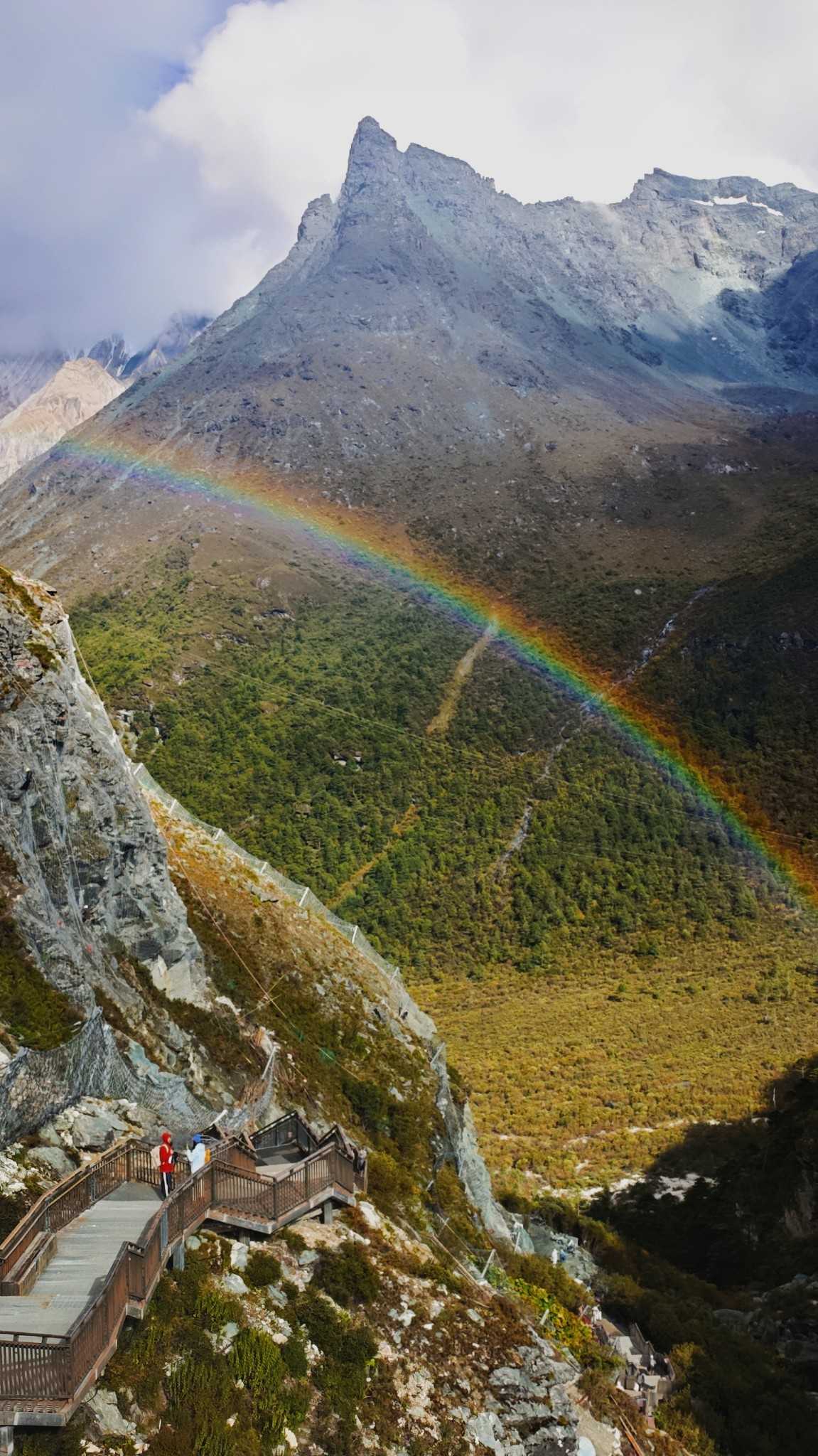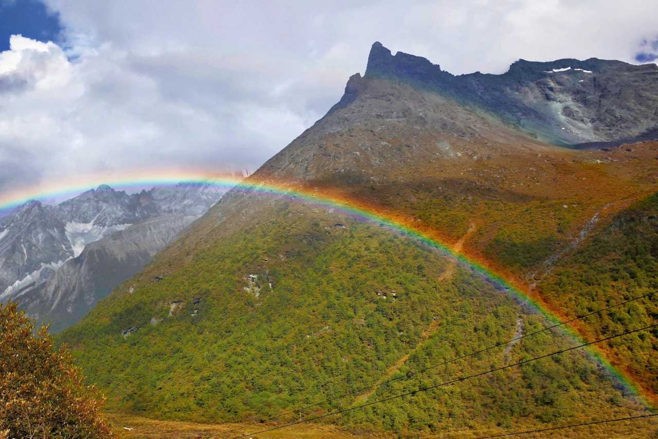 Daocheng Yading – Yading Viewing DeckThe rainbow was shockingly clear—plateau air is clean with little dust, saturating colors beyond ordinary. We chased the best angle along winding road, watching it appear and vanish between woods—adding fun to a tiring return.