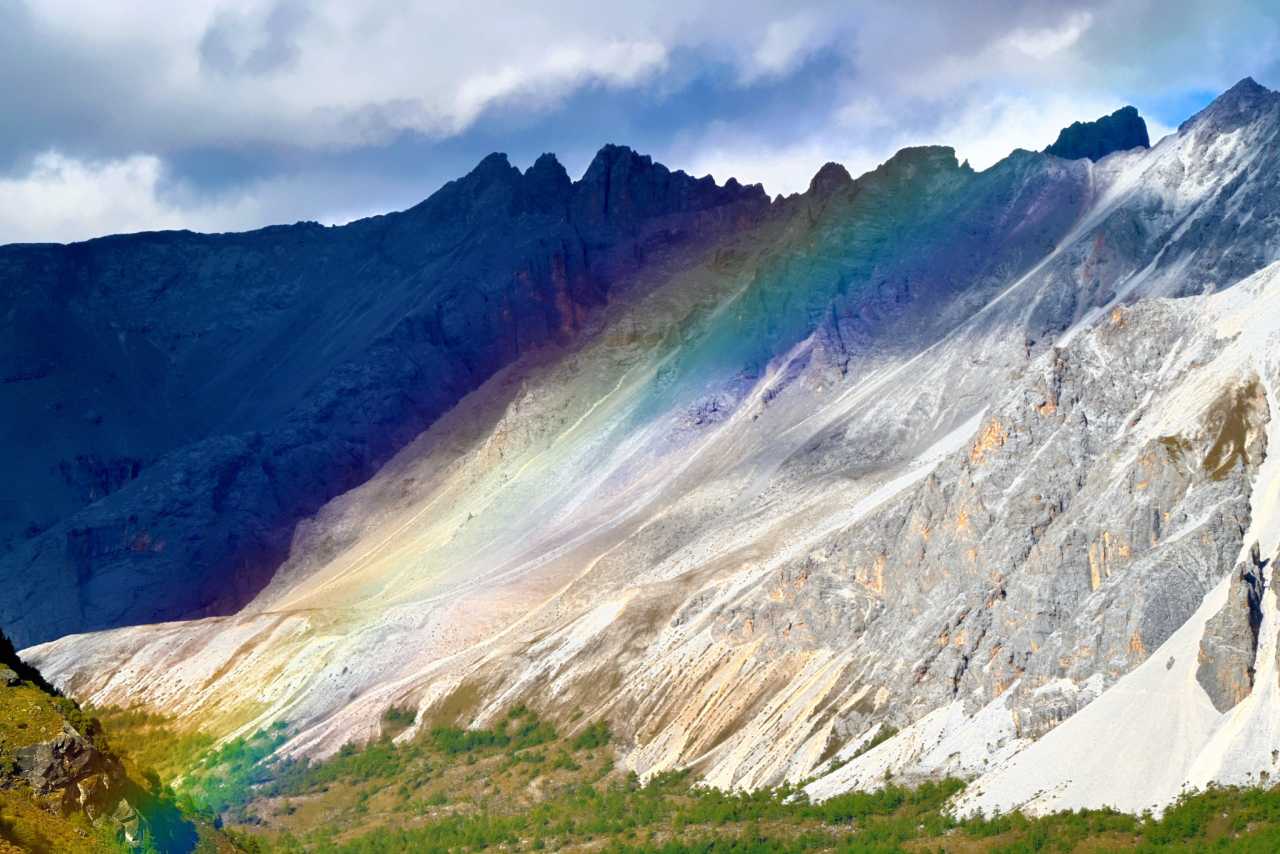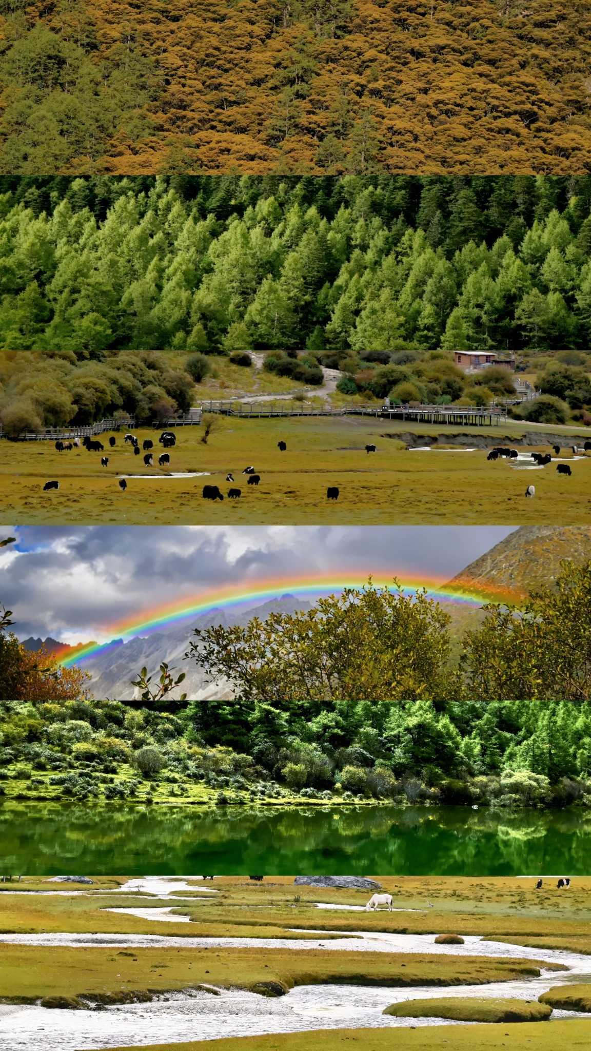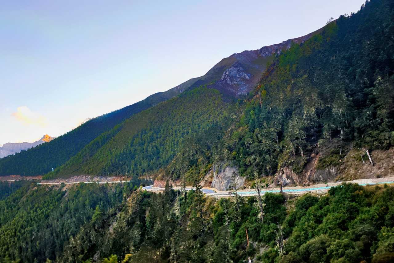 Daocheng Yading – Yading Viewing DeckThe rainbow was shockingly clear—plateau air is clean with little dust, saturating colors beyond ordinary. We chased the best angle along winding road, watching it appear and vanish between woods—adding fun to a tiring return.