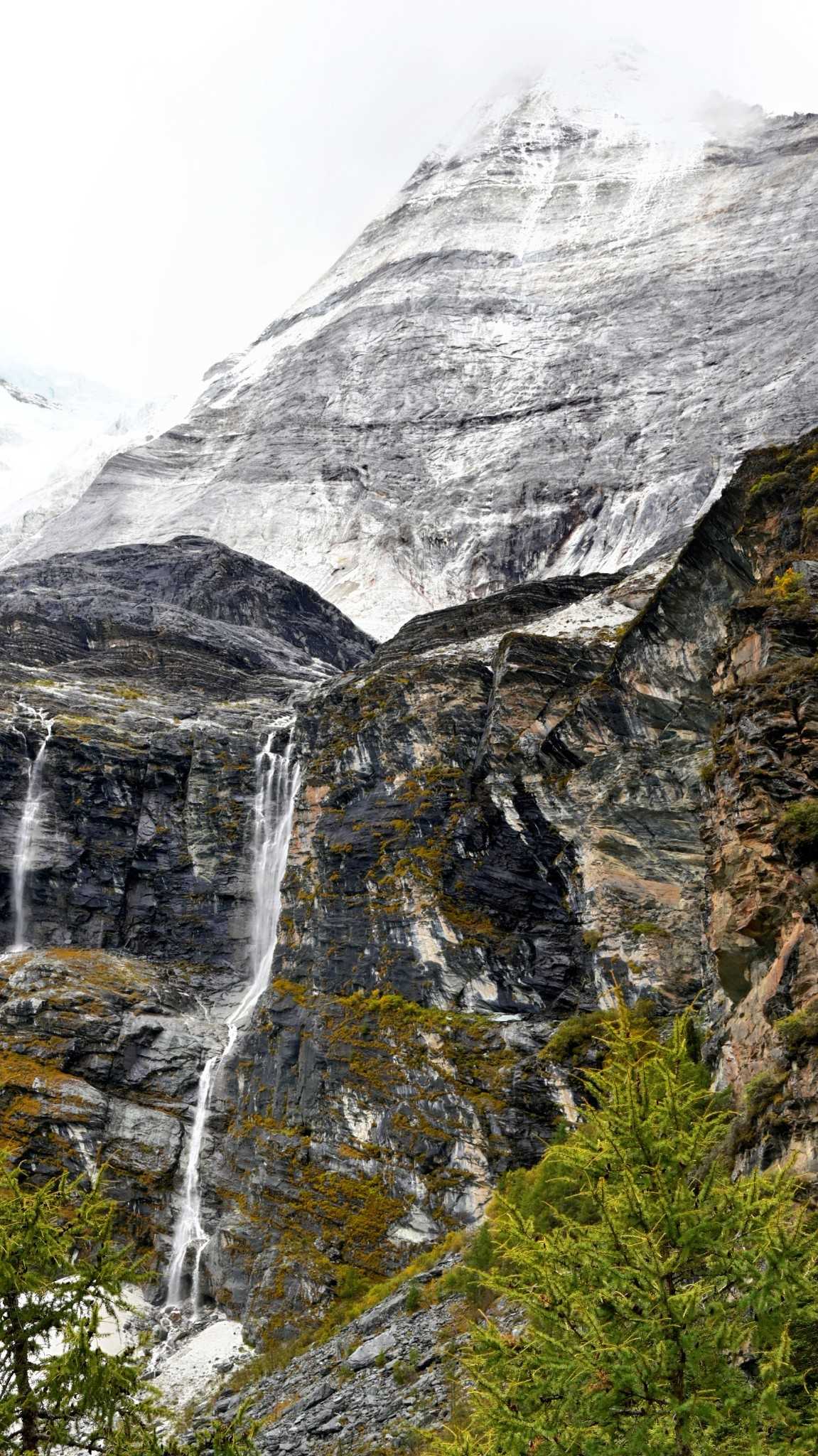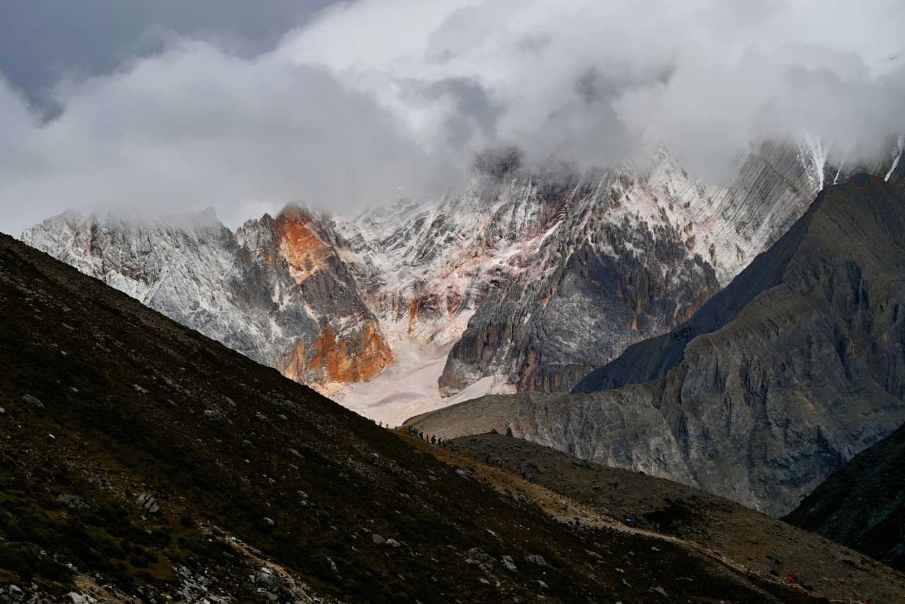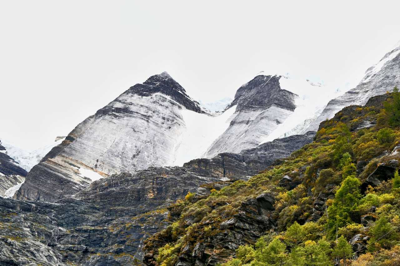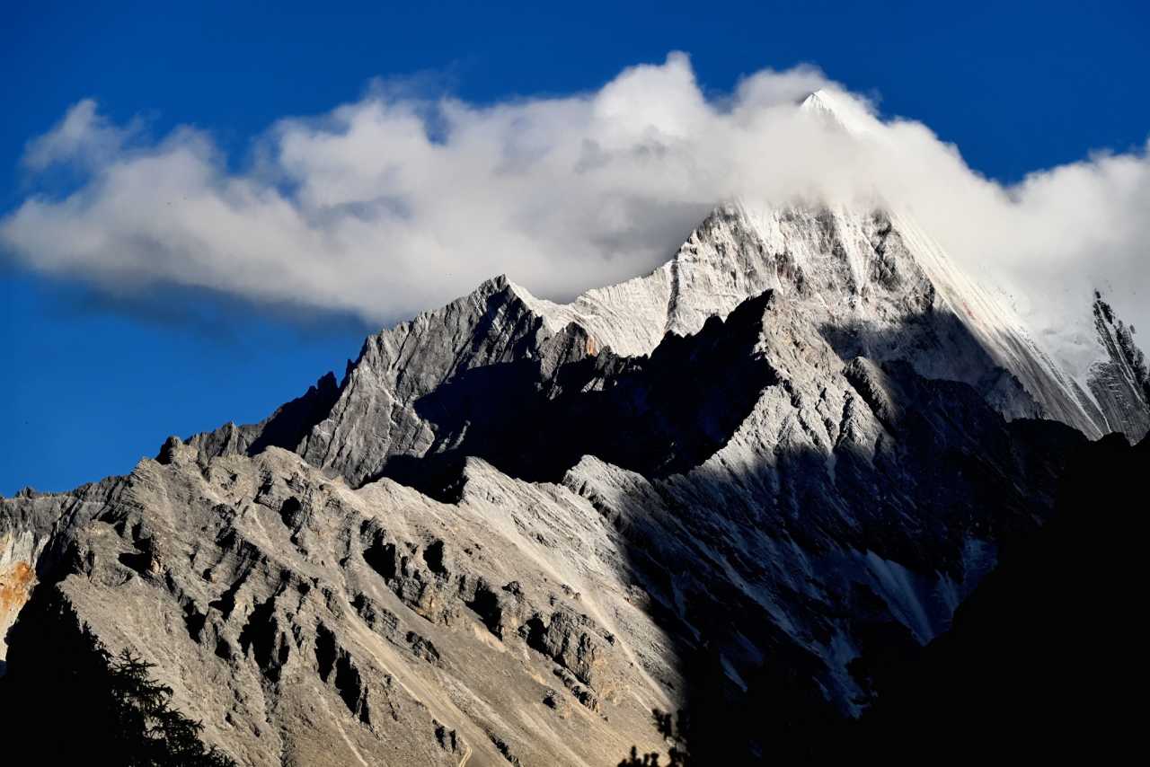 Front and center, Yangmaiyong rises like a wall of the gods. From base to tip, rock textures sharpen—marks carved by windblades and ice. Dim light casts deep shadows between corrugated walls and glacial channels—like hearing ancient glaciers sighing as they retreat.
