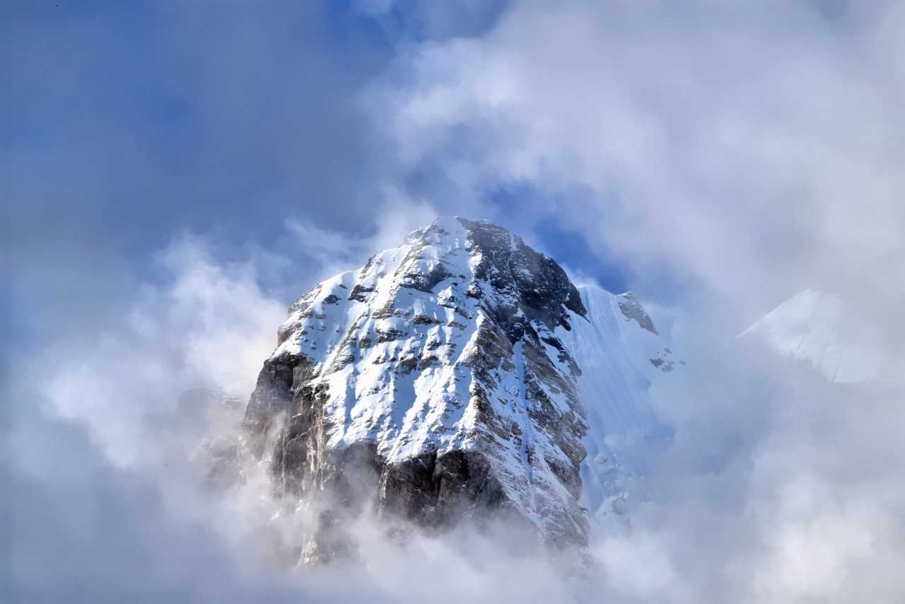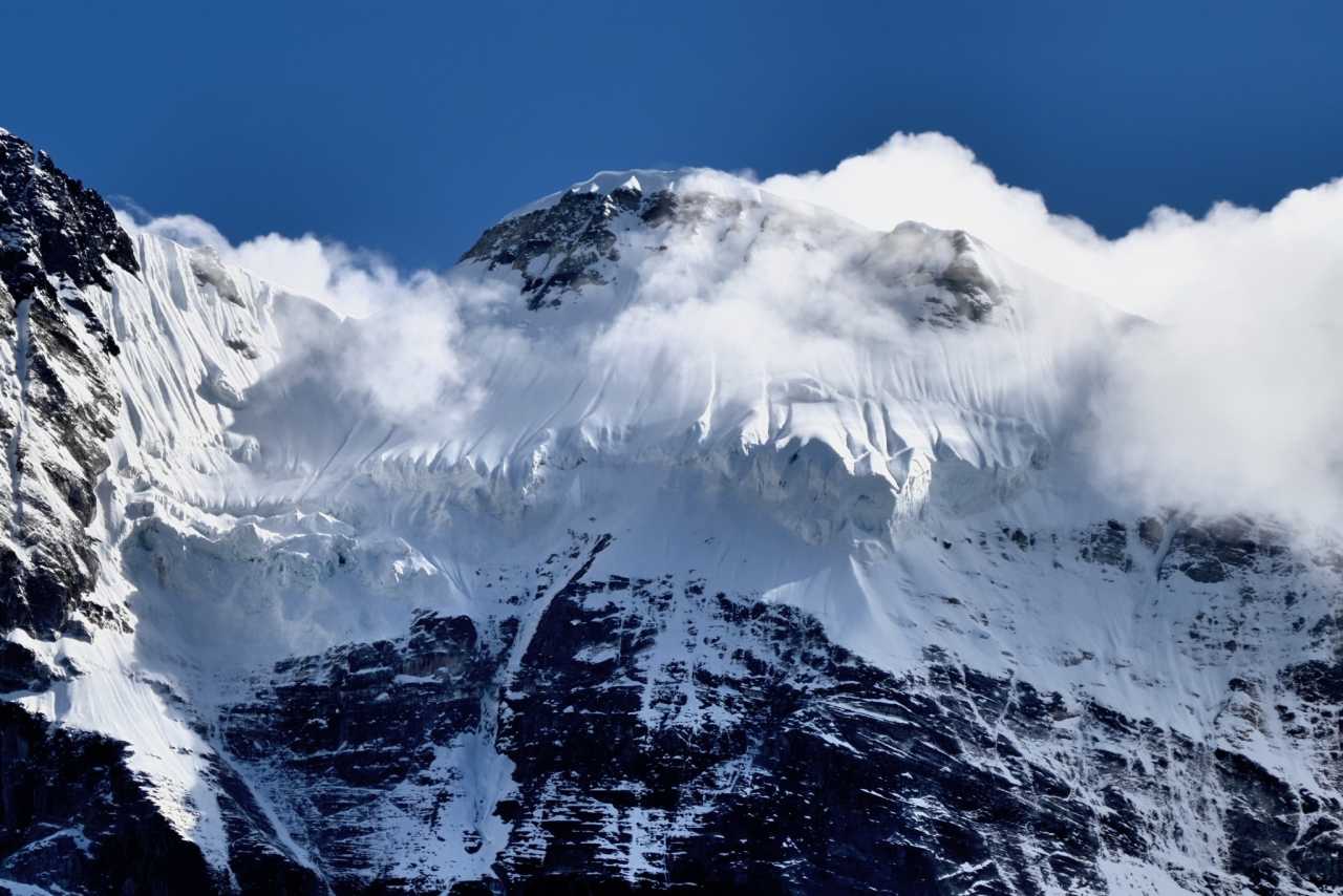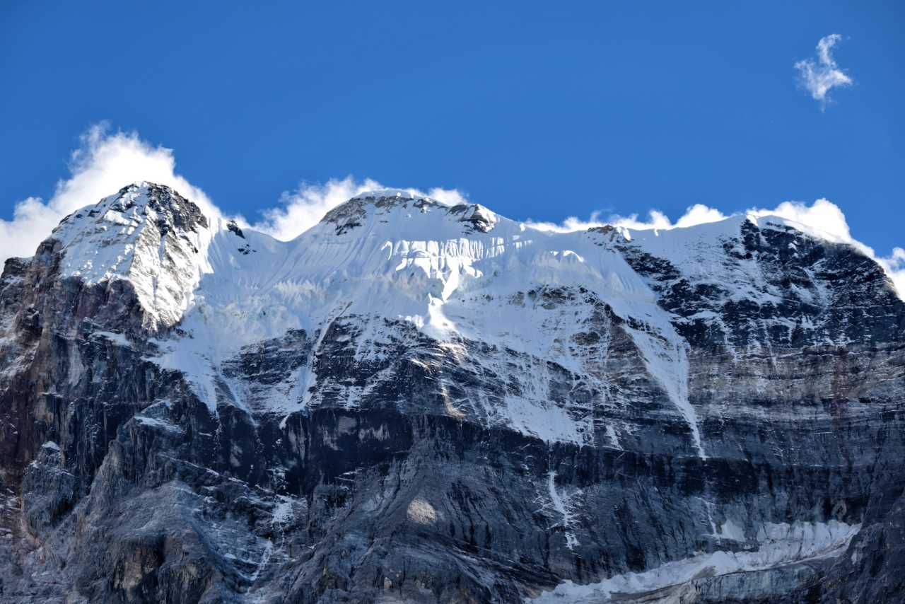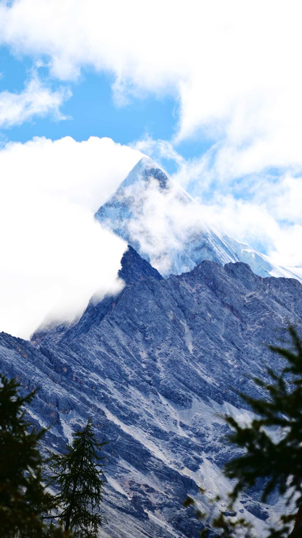 Front and center, Yangmaiyong rises like a wall of the gods. From base to tip, rock textures sharpen—marks carved by windblades and ice. Dim light casts deep shadows between corrugated walls and glacial channels—like hearing ancient glaciers sighing as they retreat.