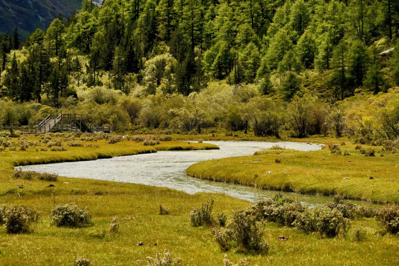 Daocheng Yading – Chonggu MeadowOn sunny days, afternoon light is richest here. The meadow spreads like a giant brocade; streams meander between grasses, water clear and bright.