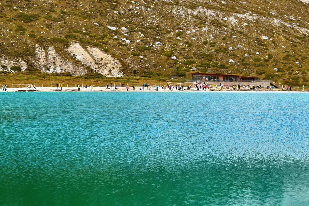 Five-Color LakeFrom high up, the lake is much smaller than Milk Sea, quieter, without the iconic milky rim—plain on an overcast day. Many hikers descend slopes to seek subtle color shifts; we lacked time and energy—took a quick look and left.