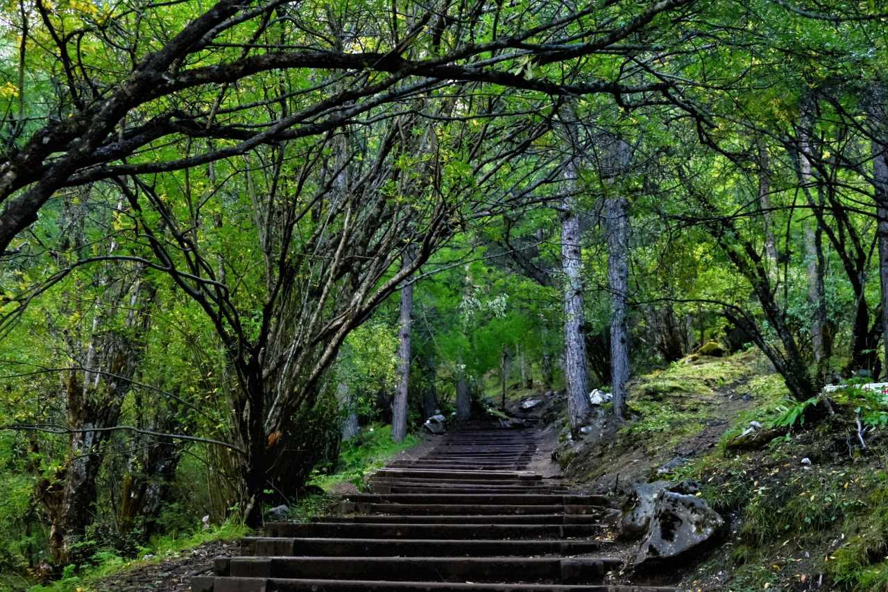 Daocheng Yading Scenic AreaUp close, tall proud trees weave a deep canopy, sifting flowing, mottled light.