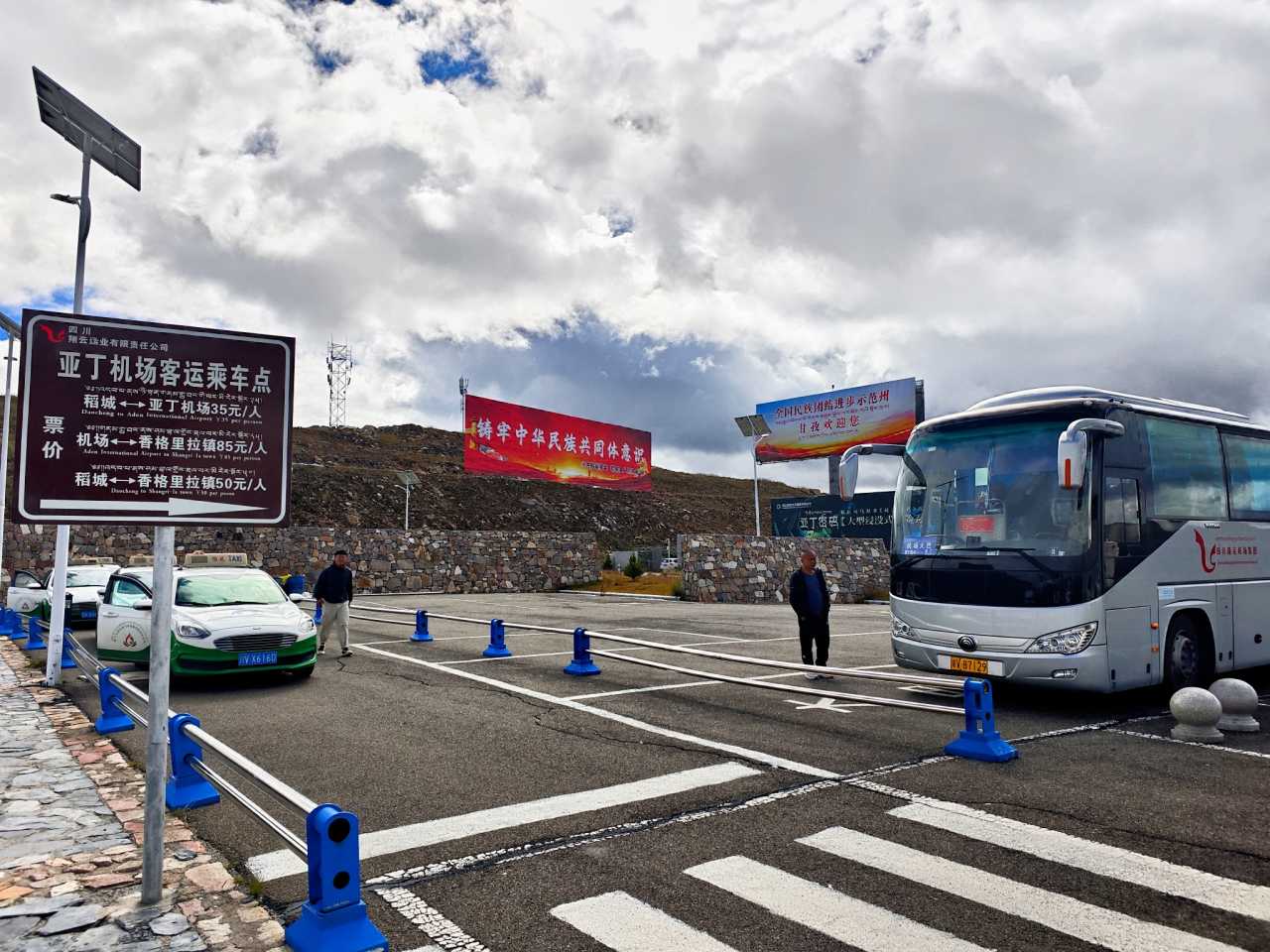 Daocheng Yading AirportTo town there are two options: private cars solicit at arrivals—100 RMB/person to your hotel; or scheduled buses at the right of the main exit behind the white wall—85 RMB/person—also to your hotel. Both take ~1.5–2 hours.