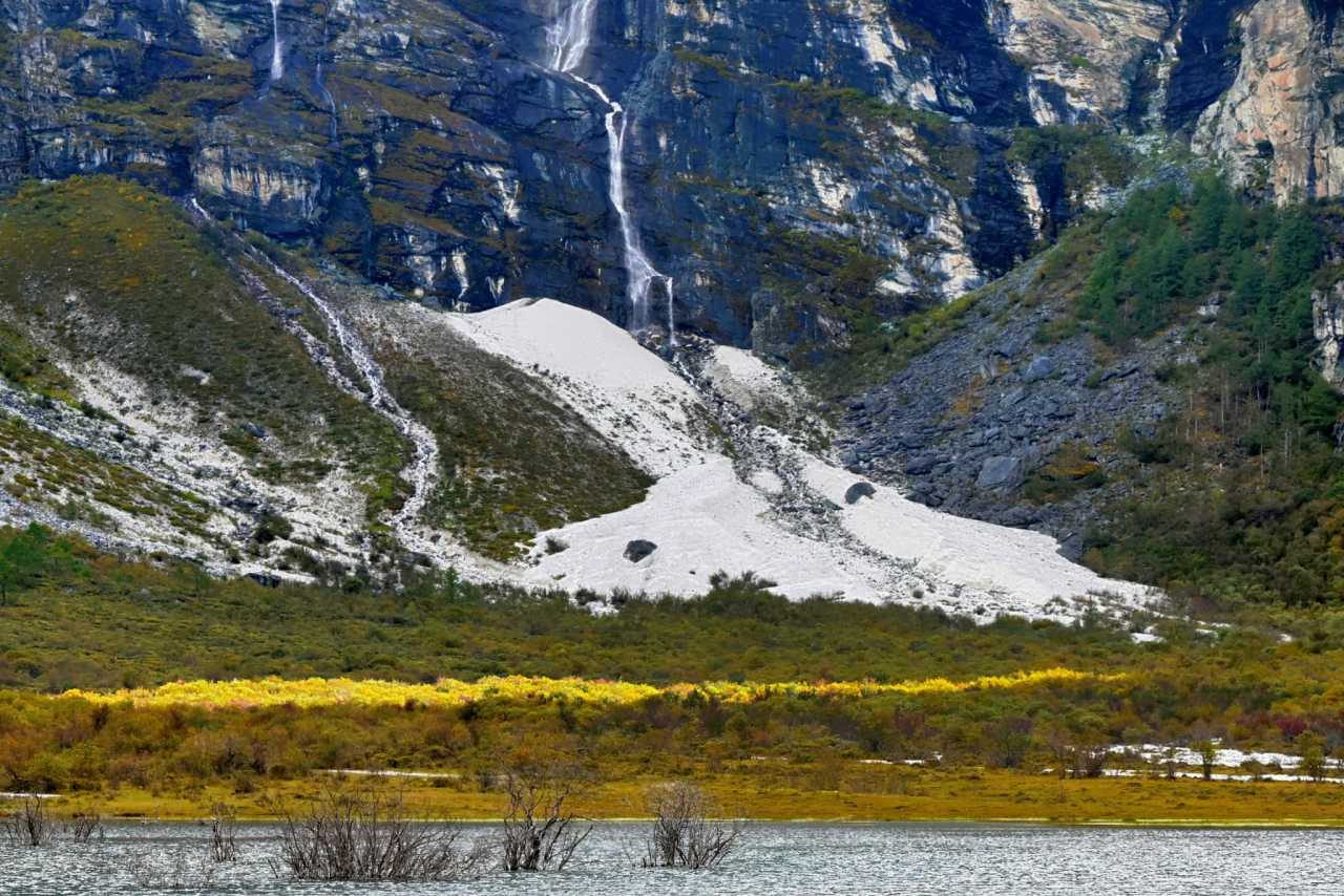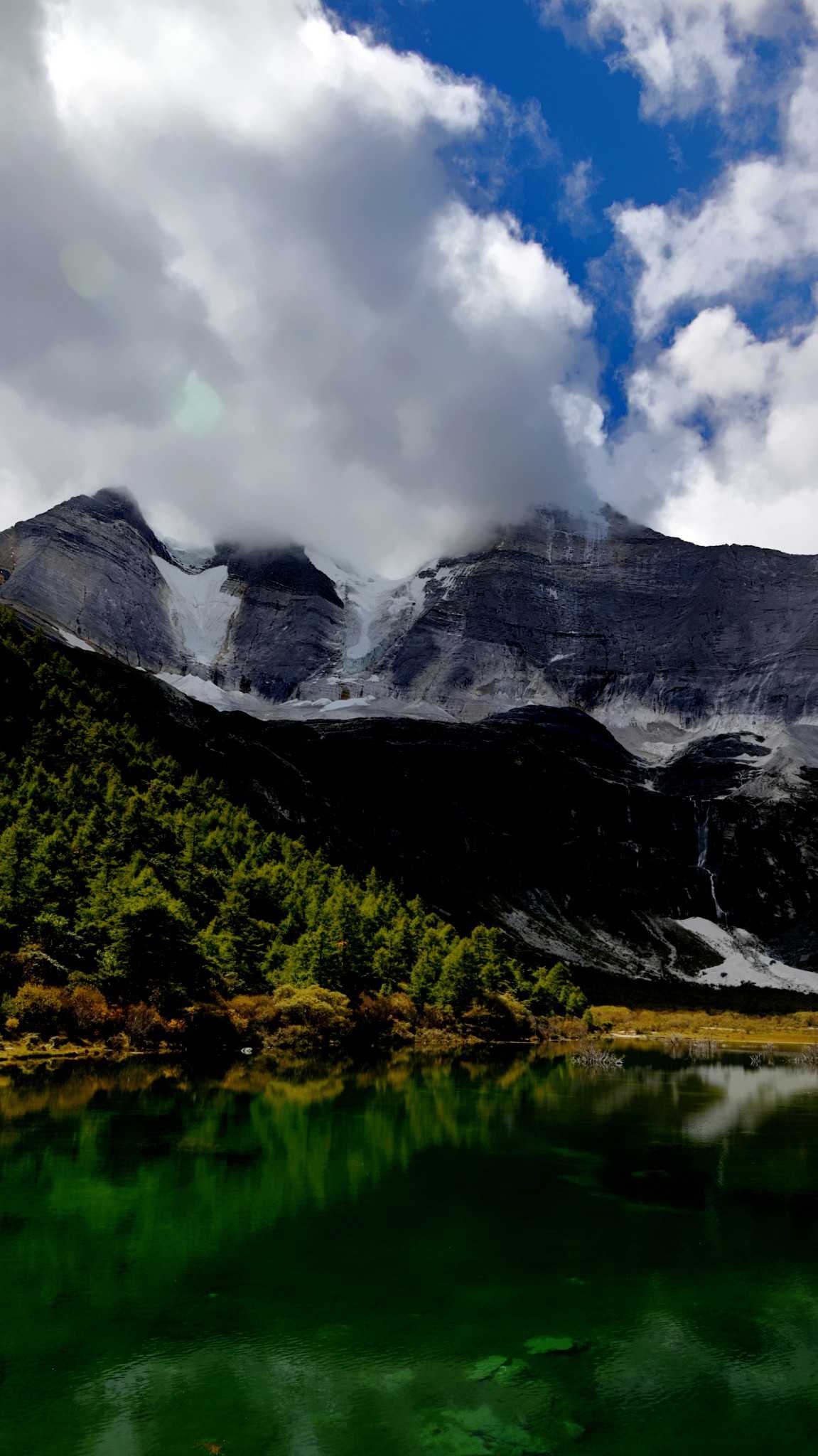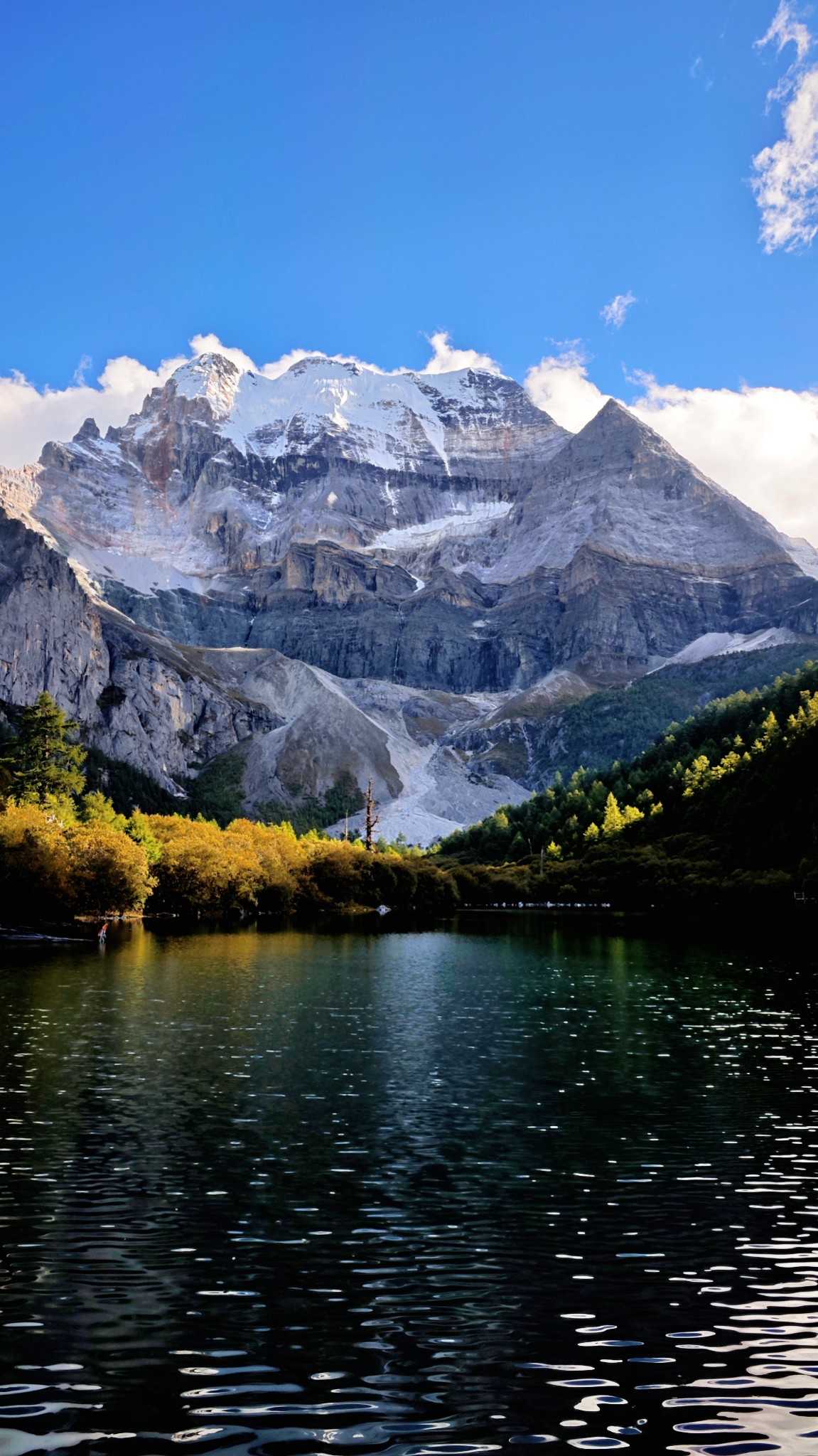 Autumn in Daocheng Yading is alpine lakes bathed in gentle breeze atop the mountains. The ripples no longer bitterly cold; they make the azure softer. The lake calms like glass, soaking in drifting clouds, snowy summits, and golden sunlight—even ripples left by wind shimmer with heart-soothing blue.