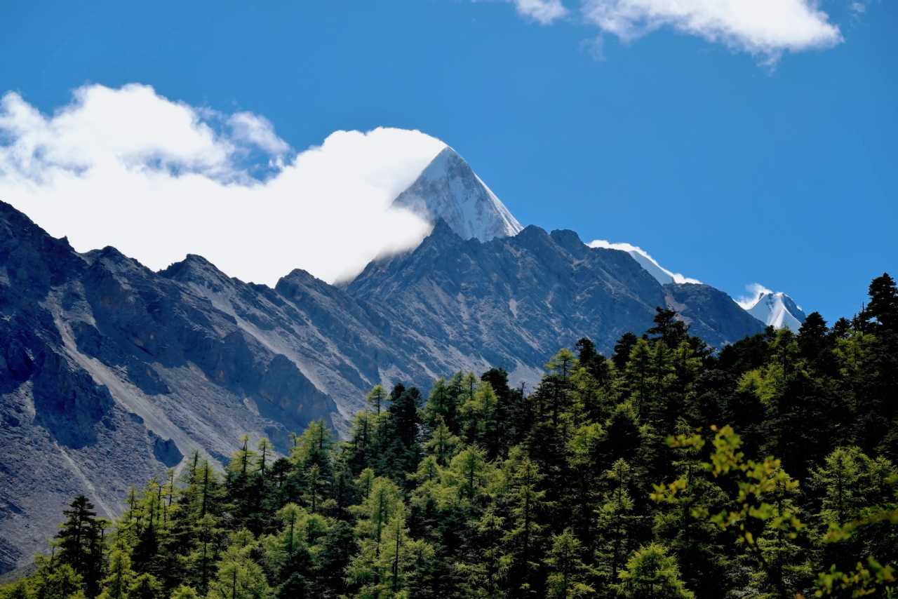 Daocheng Yading Scenic AreaIn the distance, only mountain tips that break free of forest sketch a rugged skyline;