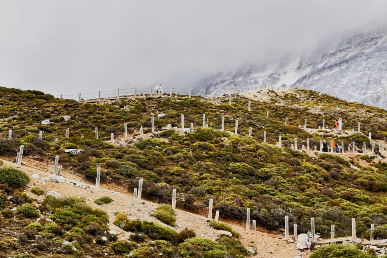 Thankfully, our old mantra “since we’re here” anchored us. Highland weather flips fast—downpour one moment, clear the next. From the platform to Milk Sea the route eases to trail—but rain turned it slick mud. Some sections are under slope-side construction—nets and machines narrow the way to single-file; puddles and stones complicate footing.