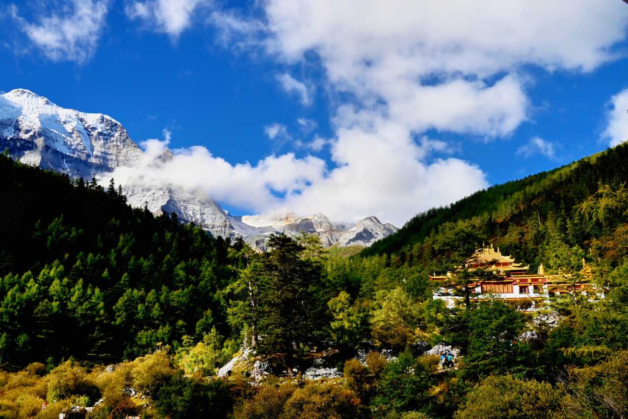 Daocheng Yading – Chonggu MeadowThe meadow is wide-open; even from far you can still see Chonggu Monastery near Zhaguanbeng. White walls and golden roof tucked among swathes of green—feels secluded and hidden in plain sight.