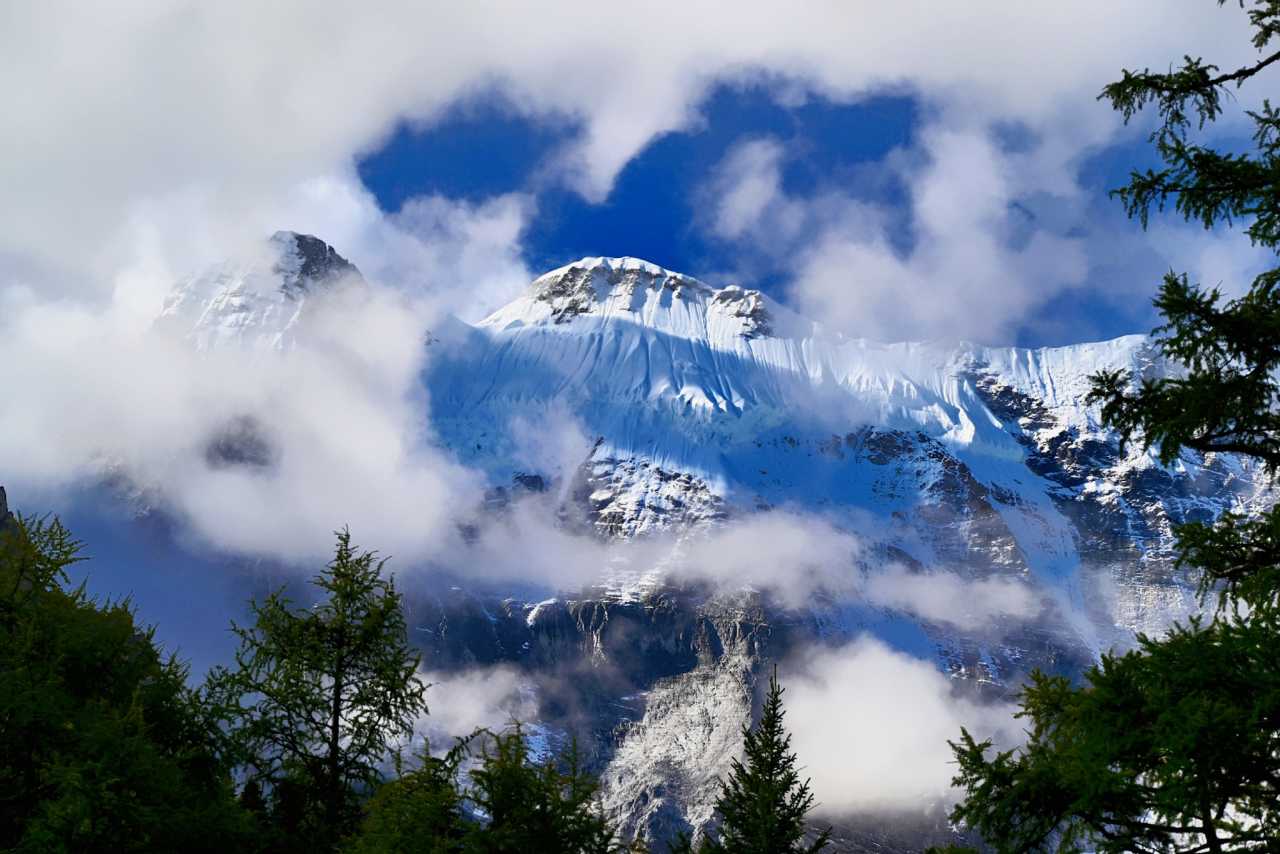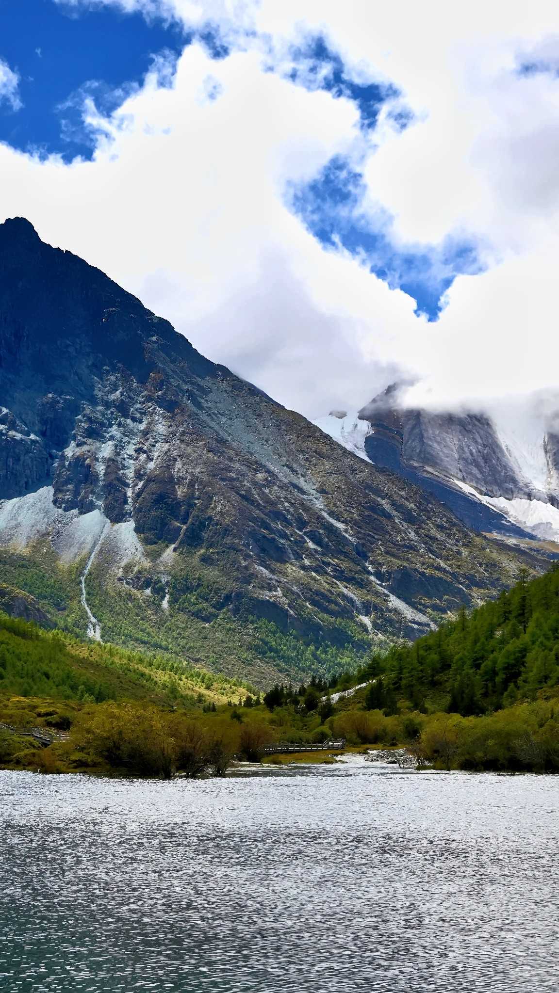 Five-Color LakeEn route you also enter Xiannairi’s domain—the chief among the three. Massive body spans the front; snow and glacier textures are clear—almost within reach. At Pearl Lake you only see the reflection; here you sense its breath.