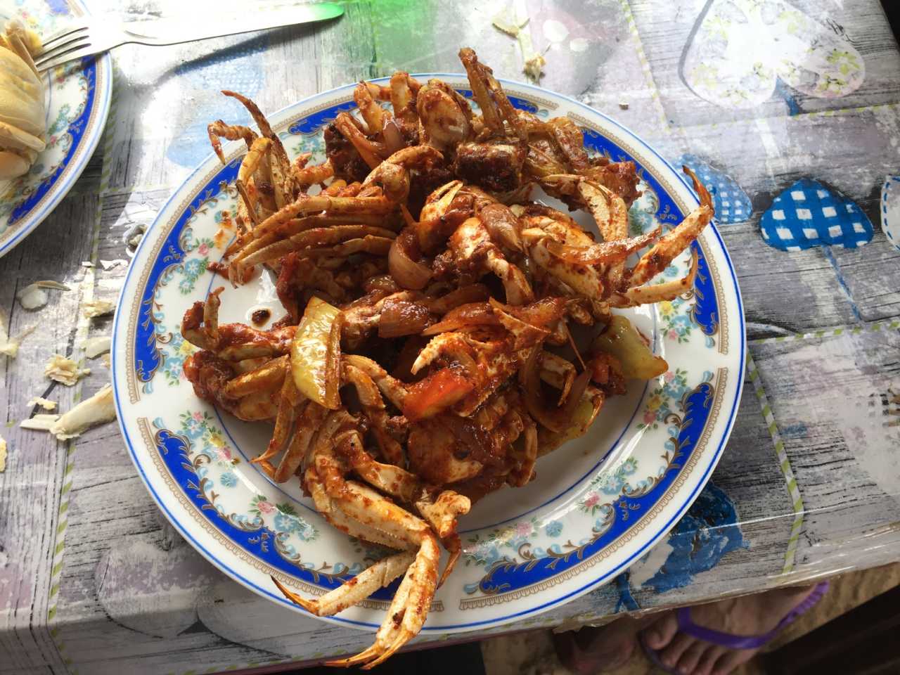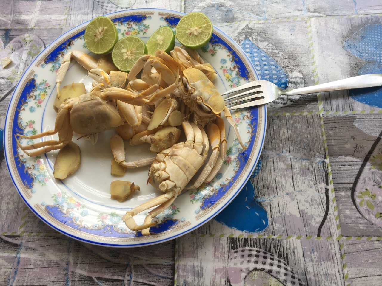 My two buddies came to Sri Lanka to hunt insects. During the day I helped them buy flashlights, shovels, and buckets in town. At 9 pm they went out bug‑hunting while I, with older‑man habits, went to bed. Half an hour later they burst back in: “Bro, let’s catch crabs!” “Where? How big?” They showed me a crab as big as a Chinese river crab. “Forget sleep—let’s go! Lunch for tomorrow!” We set off in swim shorts and flip‑flops. The flashlight along the shore lit up lots of crabs. It was high tide; the crabs came out to bask in the moonlight. We divided roles: I handled lighting; Ergou covered with the bucket; Dayan shoveled crab plus sand. At first the crabs drifted and Ergou repeatedly plunged into the sea with the bucket without success. Later he figured out the pattern: approach from the sea, let the wave hit the crab to slow it, cover in one move; then Dayan and I rushed in to help. After half an hour we harvested more than a dozen fat crabs—big claws, lots of meat! We lay on the beach and watched the Milky Way; the sea breeze was so pleasant—though the two rough dudes snoring beside me were less ideal… The next day our task was to turn the crabs into delicious dishes. I found a restaurant owner and negotiated a price (only 300 LKR—nice). I improvised a steamer with a sieve and pot and made steamed crabs; the owner’s wife cooked a local spicy crab. We invited them to try; they said they don’t eat this kind, so more for us. Thin shells, lots of meat, naturally savory without salt—excellent. First time I ate crab till stuffed. If you come to Sri Lanka’s coast, definitely try catching and eating crabs—fun and tasty.