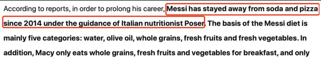 According to reports, after 2014, in order to extend his career, Messi followed the advice of Italian nutritionist Giuliano Poser and began to stay away from pizza and carbonated drinks, and switched to whole grains and potatoes as staple foods, such as brown rice, oats, and potatoes.